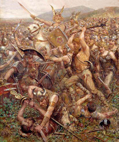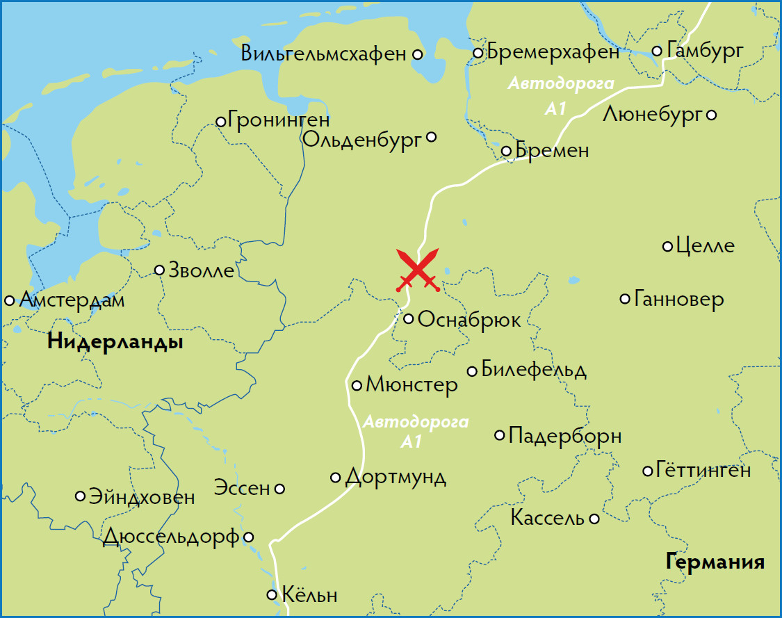 К началу XVIII века немецкие учёные смогли в целом решить эту географическую загадку, связав воедино Тевтобургский лес, упомянутый Тацитом, и горы, найденные у Диона. Они пришли к выводу, что речь не может идти ни о чём ином, как о Везерских горах, чьи отроги из песчаника и известняка оставались покрытыми густым лесом. В начале XIX века немцы, увлечённые мечтами о германском единстве, стали собирать деньги на монумент Арминию. Спустя несколько десятилетий, в 1875 году, власти недавно восстановленной Германской империи реализовали романтический проект, установив памятник на южном склоне Везерской гряды. Как и сама Германия, грандиозный Арминий много пережил с тех пор, о чём у нас будет отдельный разговор, но, увы, он стоит не на месте битвы. Археологи заметили, что на противоположном склоне гор, к северо-востоку от Оснабрюка, рядом с местечком Калькризе, подозрительно много военных и гражданских находок I века, в подавляющем большинстве — римских. В конце 1980-х годов начались полномасштабные раскопки, и теперь можно с определённой уверенностью сказать, что именно здесь произошло Тевтобургское сражение.
