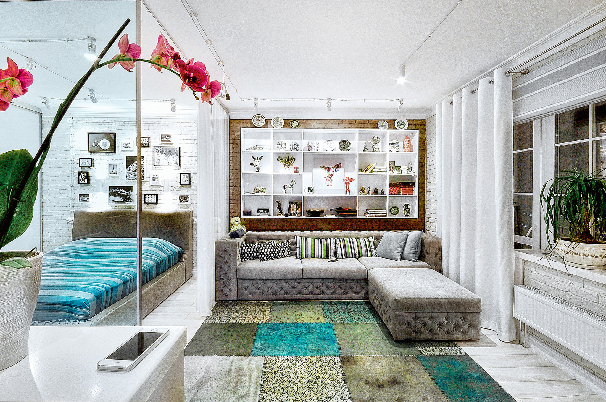 Не нужно превращать маленькую квартиру в студию, лишенную внутренних перегородок: возникнут проблемы с размещением необходимой мебели, станут заметны скромные размеры комнаты, исчезнет чувство защищенности и уюта. По возможности лучше устроить отдельную спальню или расположить ее в алькове. Прихожую стоит частично отделить от зоны приемов, чтобы было проще поддерживать чистоту и обеспечивать психологический комфорт. Для этой цели также подойдут мобильные системы (раздвижные двери, занавеси, экраны, ширмы): они позволяют внести разнообразие, изменить пропорции и атмосферу в помещении. Функцию разделителя соседних зон может выполнять мебель: барная стойка, заменяющая обычный стол, высокая спинка дивана, комод – такой прием помогает создать ощущение легкости и простора. Удачный вариант при студийной планировке – отдельно стоящая компактная перегородка (до потолка или же не очень высокая), которая разделяет кухню-столовую и гостиную, примыкающая к одной стене либо же с круговым обходом.