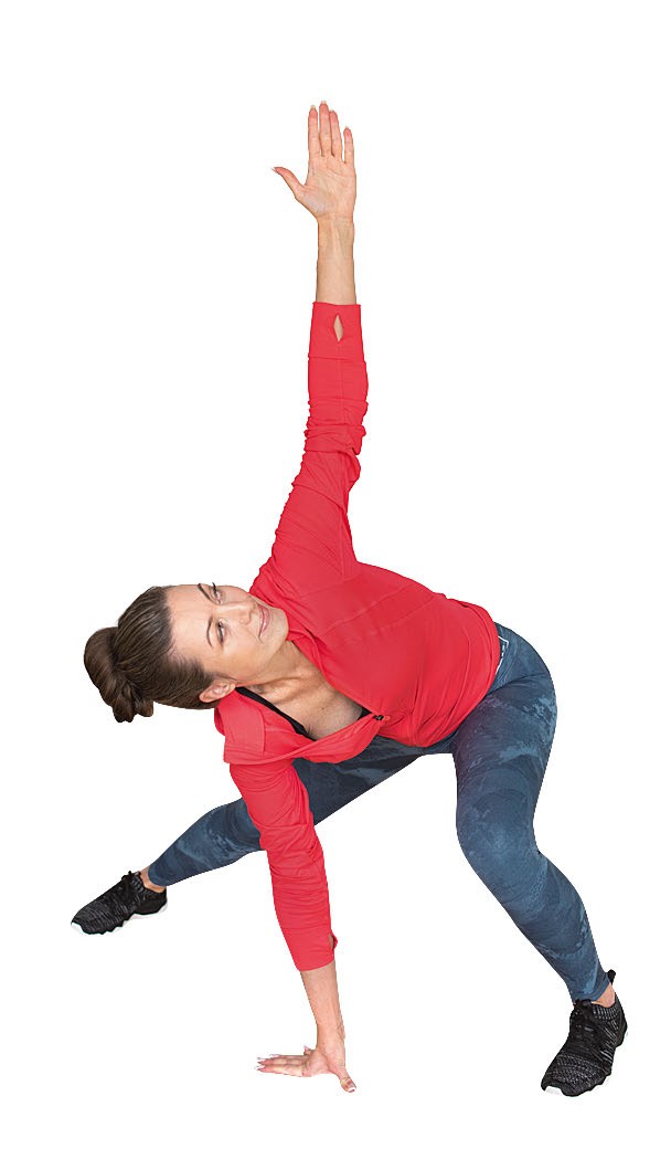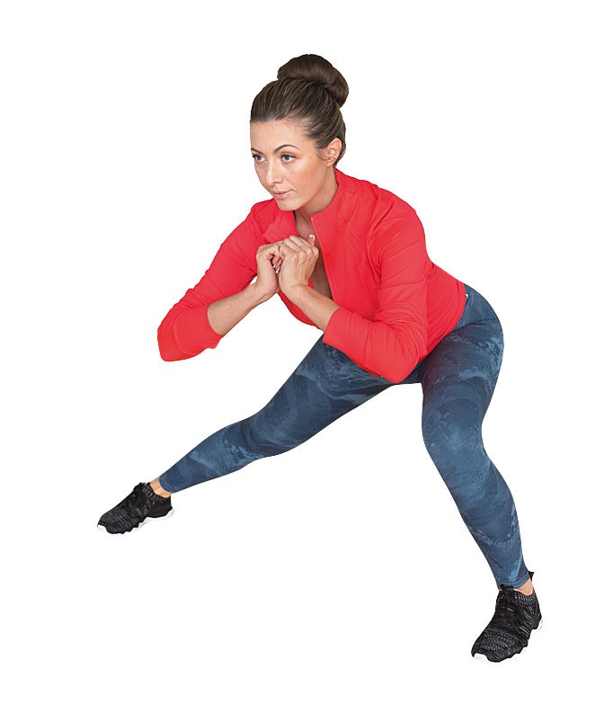 2. Добавьте ротацию. При выполнении выпада разверните корпус к согнутому колену, удерживайте мышцы центра в тонусе. Выполняйте это упражнение поочередно 10–20 раз. Следите за дыханием, выдох с усилием.