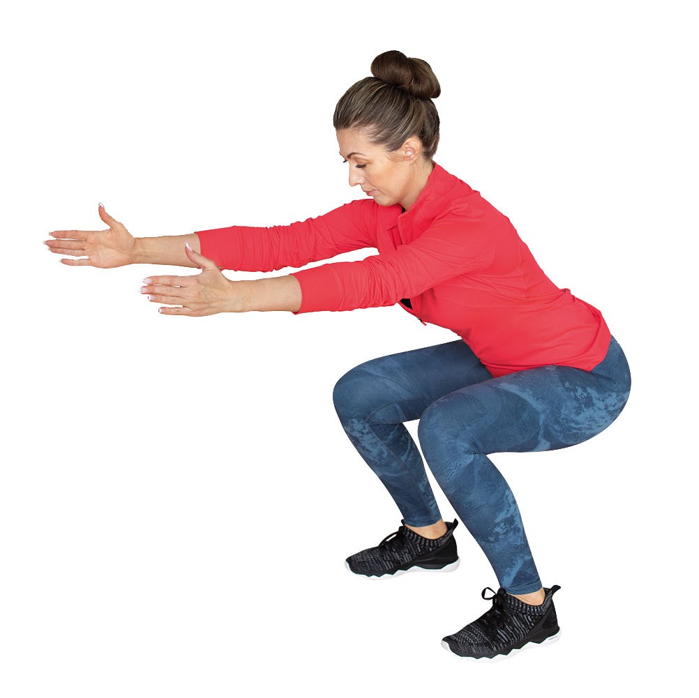 1. Ноги на ширине плеч, мышцы пресса напряжены. Согните колени и выполните приседание. Разогните колени и вернитесь в исходное положение, напрягите ягодицы.