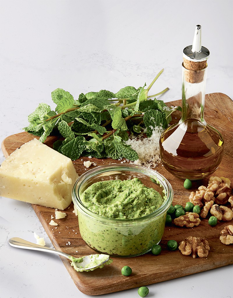 Молодой зеленый горошек, нежный и сладкий, можно превратить в чудесный соус а-ля песто. Измельчите его в блендере, добавив большую горсть базилика, немного орехов (можно взять грецкие), зубчик чеснока, оливковое масло, сок лимона, пармезан и соль по вкусу. Можно подавать песто на подсушенном хлебе или c овощами гриль.