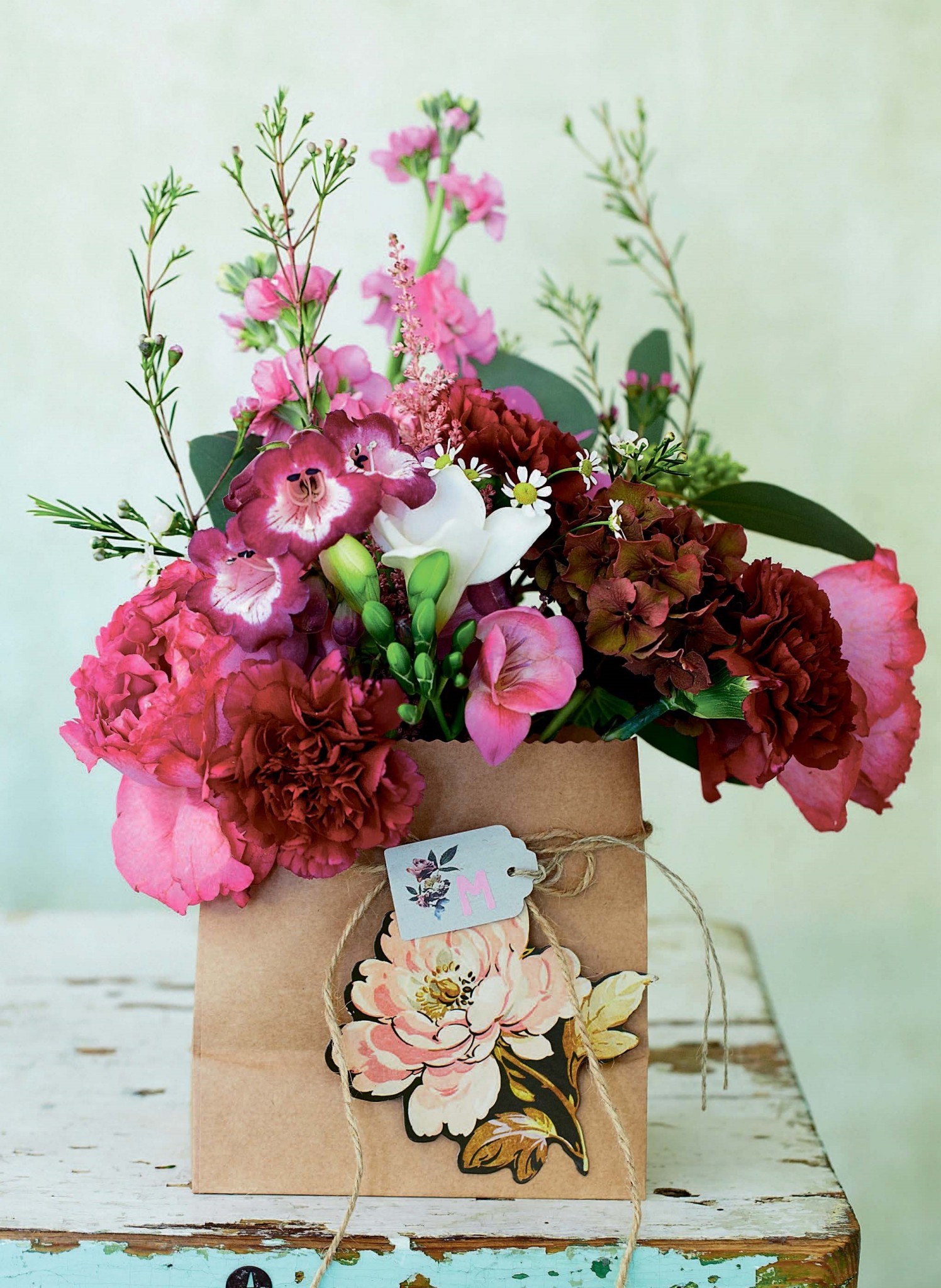 Садовые цветы в пакете из крафт-бумаги, который послужит декоративной вазой.