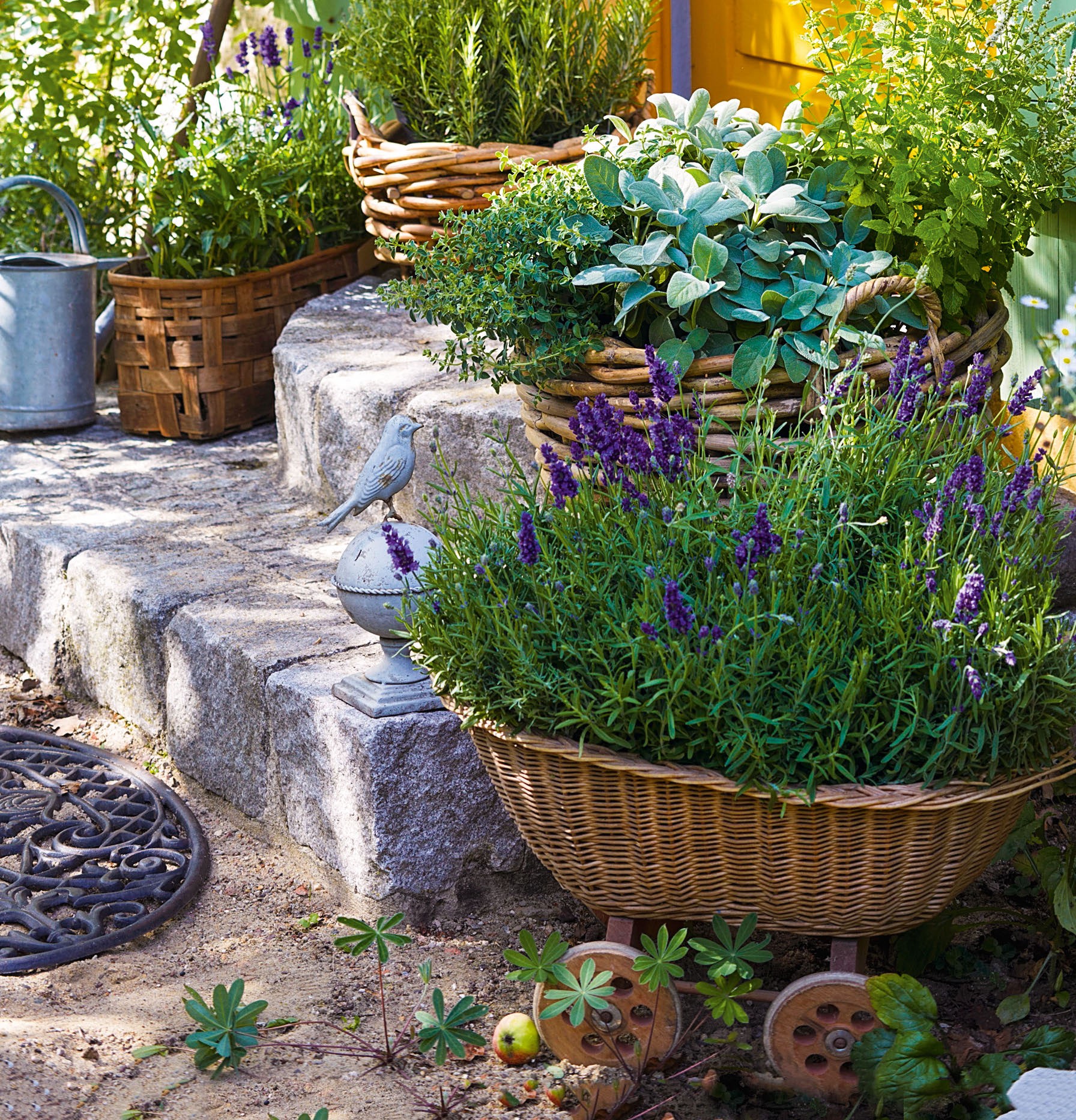 Если у вас не так много времени, чтобы ухаживать за растениями в саду и вы предпочитаете клумбам и грядкам идеальный газон, идея оформить сад растениями в контейнерах должна вам понравиться. Цветочную рассаду можно купить в садовом центре, а в качестве контейнеров использовать самые разнообразные предметы: корзины, вазоны, старую садовую утварь. Важно позаботиться о дренаже и регулярном поливе – земля в контейнере высыхает горазд быстрее, чем на клумбе.
