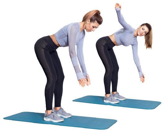 Как выполнять: Отведите таз назад и немного согните колени, встаньте в наклон с нейтральной спиной под углом 30 градусов и расслабьте руки. Раскрывая грудной отдел вправо и влево, выполняйте вращательные движения плечевым поясом. Таз неподвижен в течение всего подхода в 20 пар повторений.
