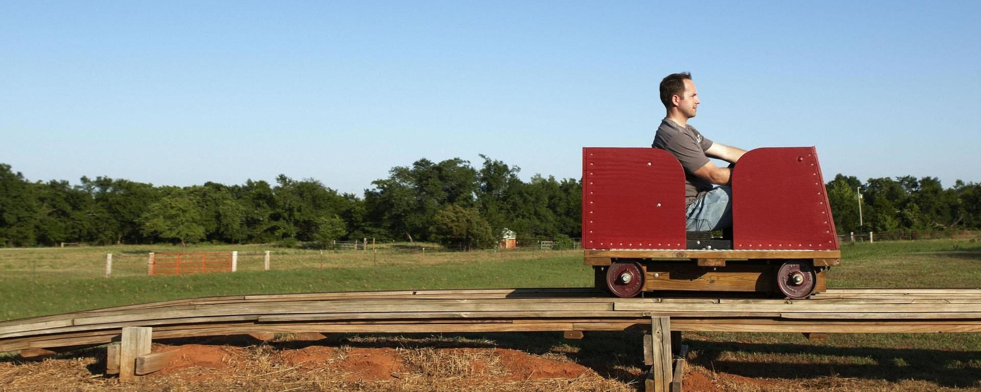 На участке в четыре гектара Джереми Рейд смастерил весьма необычное сооружение — сделанные по всем правилам американские горки. «Как только я начал обучение в инженерном колледже, — говорит изобретатель, — я сразу понял, что такая конструкция будет мне по силам». На работу над монументальным проектом ушло четыре года, 1000 погонных метров сосновой доски и 7000 разнообразных шурупов и гвоздей. Рейд придумывал фантастические способы, как своими силами воздвигнуть опоры для горок, как делать покрытие для дорожки и как собрать всю конструкцию воедино. Ездок усаживается в одноместную тележку, после чего электромотор мощностью 1 л.с. затягивает тележку на первую горку. Скатившись с пятиметровой высоты, тележка разгоняется до скорости 30 км/ч, взлетает на следующую горку, потом катится вниз под естественный уклон и выходит на вираж с креном в 50 градусов и перегрузкой в 2g. Через минуту, пройдя по маршруту длиной 135 м, тележка возвращается к исходной точке.
