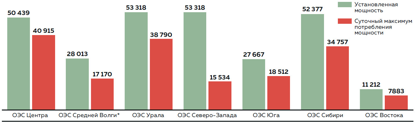 По данным «Системного оператора», установленная мощность электростанций во всех объединенных энергосистемах (ОЭС) России существенно превышает пик потребления мощности. Наименьший резерв мощности наблюдается в ОЭС Востока: по данным на 1 января 2025 года, установленная мощность составляла 11,2 ГВт при историческом максимуме потребления в 7,9 ГВт (зафиксирован в декабре 2022 года).