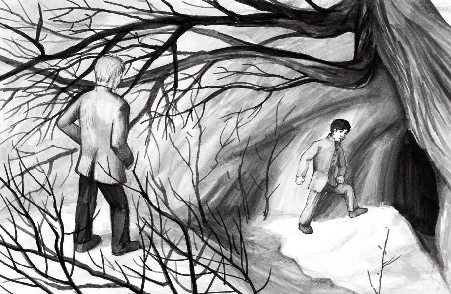 Петя поворачивает назад и видит слева от входа еще один ход. Он пробирается в него и зажигает вторую спичку. Прямо перед Петей на расстоянии вытянутой руки – фигура в белой рубашке.