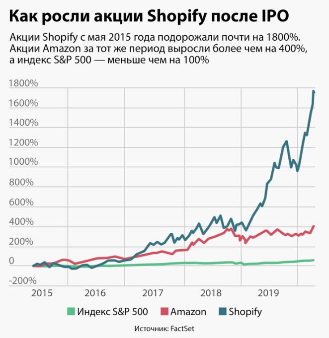 С 2015 года, когда Shopify провел первоначальное публичное размещение, акции компании подорожали в 30 раз. Сейчас с рыночной капитализацией в $60 млрд Shopify находится на седьмом месте в списке самых дорогих компаний Канады, опережая железнодорожного перевозчика Canadian Pacific Railway и медиахолдинг Thomson Reuters. Кроме того, Shopify стала «фабрикой миллионеров» для 5000 сотрудников, которые владеют опционами на сумму $2,2 млрд. Динамика цен на акции Shopify так отвлекает сотрудников штаб-квартиры, что каждый, кто попался на мониторинге биржи, должен купить коллегам коробку пончиков из Tim Horton’s.