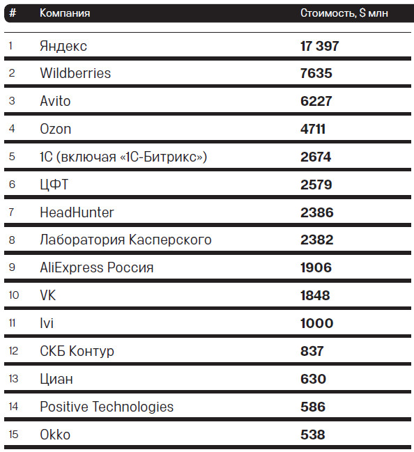 Основной критерий отбора: выручка всех компаний, представленных в рейтинге, формируется в интернете. Например, маркетплейс продает место на сайте-витрине и получает выручку именно в интернете, там же предоставляется и его услуга. Магазин с сайтом тоже продает товары в онлайне, но получает выручку в офлайне, такой бизнес мы не относили к интернет-компаниям. Лонг-лист ограничен компаниями, которые зарабатывают более 50% выручки в России или у которых на Россию приходится более 50% пользователей. Поэтому в лонг-лист не попали такие компании, как Telegram и Playrix. Для оценки стоимости непубличных компаний мы пользовались стандартными методами сравнения с аналогами по коэффициентам к выручке или обороту в зависимости от того, какие данные предоставила нам компания. Стоимость публичных компаний приведена по данным биржи на закрытие торгов 2 февраля 2022 года, для расчета долларовой стоимости использован валютный курс на эту же дату.