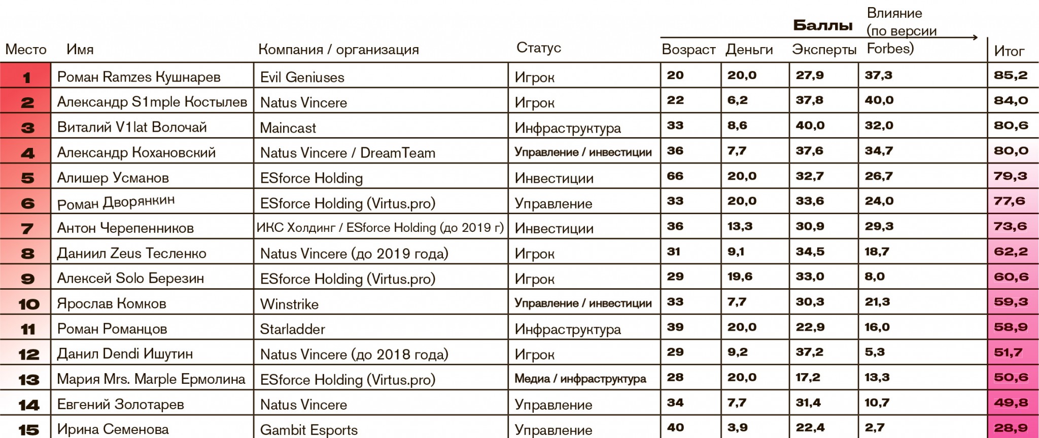 В конце июля 2019-го нью-йоркский стадион «Артур Эш», центральный корт главного теннисного турнира США US Open, на три дня превратился в красочный парк развлечений. Яркие декорации, сотни мониторов по периметру, сеты известных диджеев и безалкогольные напитки в баре — все слагаемые большой подростковой вечеринки. За одним исключением: несколько сотен подростков на арене собрались не ради развлечений. На площадке проходил первый в истории чемпионат мира по игре Fortnite. За призовой фонд объемом $30 млн от студии Epic Games боролись и россияне. В частности, $50 000 увез домой 14-летний московский школьник Марк Letw1k3 Данилов. Fortnite пока не входит в число ведущих киберспортивных дисциплин, но возраст юных звезд игры показателен: киберспорт однозначно дело молодых. В первый рейтинг самых влиятельных деятелей индустрии на постсоветском пространстве по версии Forbes вошел лишь один человек старше 40 лет — и это Алишер Усманов (№5), несколько лет назад он принял решение инвестировать в этот рынок, что придало мощный импульс развитию отрасли.