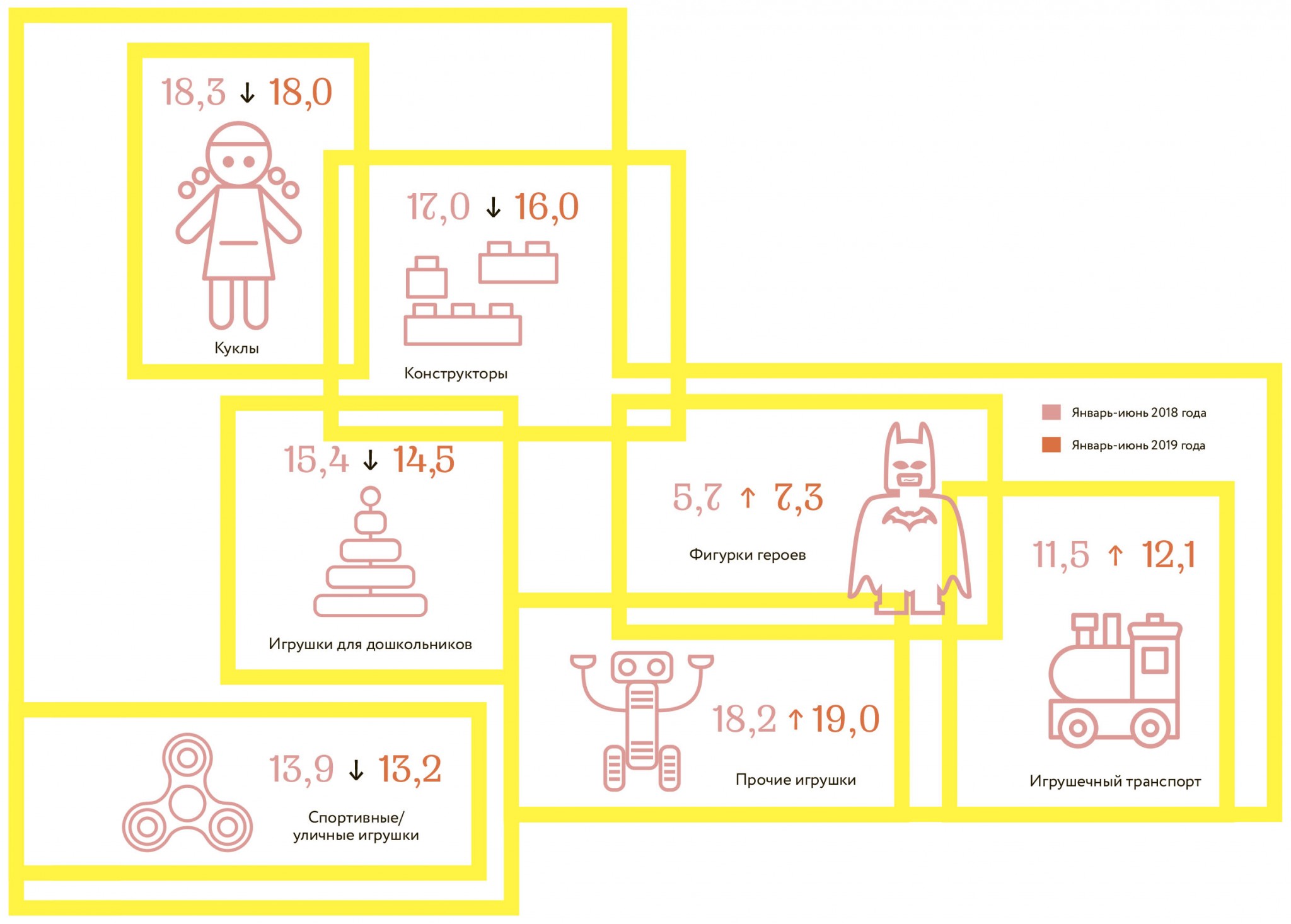 Быстрый рост сегмента фигурок во многом связан с нишей коллекционных игрушек, выпускаемых к релизу новых фильмов (в этом году новые фигурки появились, в частности, к выходу «Истории игрушек 4» и «Приручить дракона»). Заметное уменьшение доли конструкторов обусловлено некоторым насыщением сегмента. Конструкторы пользовались активным спросом предыдущие два года, но в 2019 году показали меньшую динамику продаж, чем модные игрушки. Снижение продаж игрушек для дошкольников определено двумя факторами: в России сократилось количество детей этого возраста, к тому же в этом сегменте родителям удается экономить на покупках, поскольку дети-дошкольники еще не принимают активного участия при выборе игрушек в магазинах.