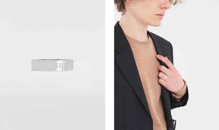 Связано это с приходом в бренд Джона Гальяно в роли креативного директора или нет, но в последнее время мужская линия Maison Margiela стала особенно активно развиваться, и ювелирное направление, которое всегда заслуживало отдельного внимания, — тоже. Команда бренда старается продолжать дело своего легендарного основателя, масштабируя его с учетом требований времени: крупные овальные и квадратные перстни-печатки; браслеты в виде массивных цепей; подвески с кожаными бирками, имитирующими армейские; плоские серебряные кольца с выгравированной надписью Fragile — отсылка к принту, имитирующему скотч, которым заклеивают коробки с хрупким содержимым.