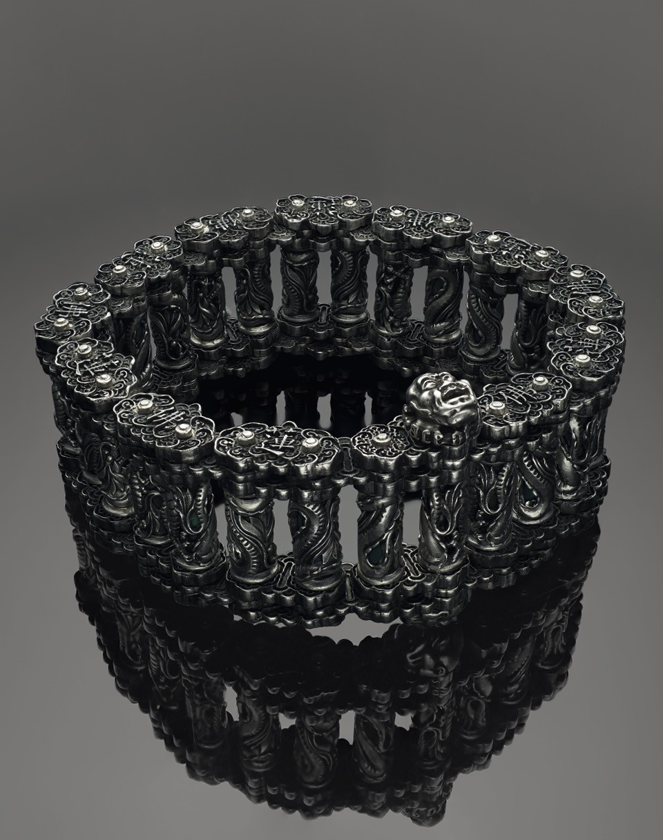 Возможно, вы реалист и не верите в тайные знаки. Пусть так — чтобы оценить виртуозность ювелиров, выковавших этот брутальный браслет, не нужно разбираться в эзотерике. Изучая одни только сочленения деталей, можно достичь буддистского просветления — инженерных находок в украшении даже больше, чем скрытых символов. Звенья собраны из малахитовых цилиндров, обвитых драконами из серебра, и соединены уникальными креплениями. Такой браслет без труда