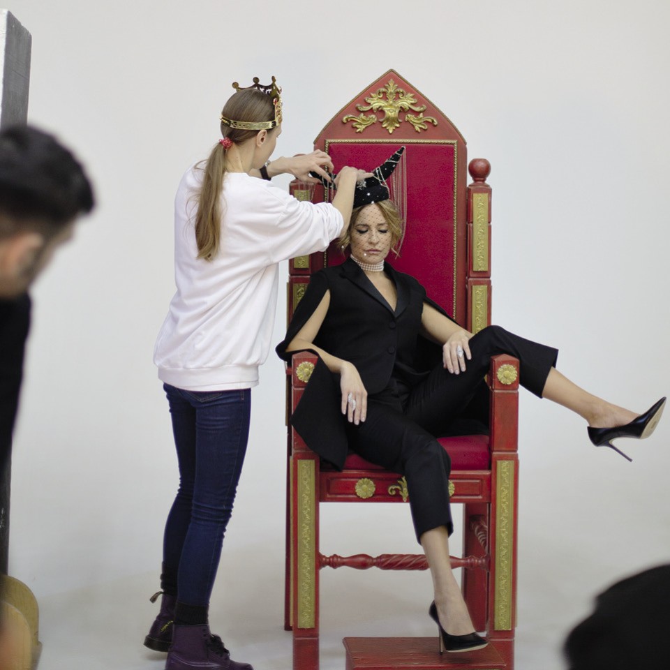 На этом кадре видно, как Виктория Шелягова постигает непростую науку правильной посадки на трон (левая нога нет-нет да и прыгала на подлокотник). Тем временем над шляпой-полумесяцем
