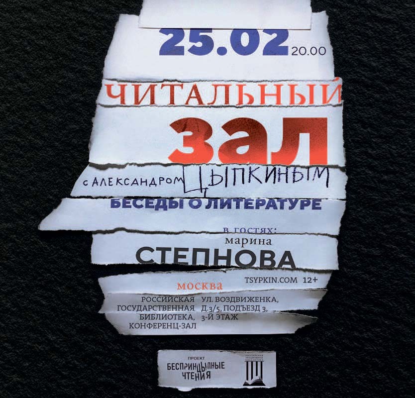 Проект Александра Цыпкина и Ленинки «Читальный зал» – это экспериментальное ток-шоу, в котором публицист будет интервьюировать литераторов. Зрители смогут стать участниками разговора, а также заранее ознакомиться с подборкой произведений героев, составленной РГБ. Первой гостьей станет Марина Степнова – писательница и лауреат множества премий.
