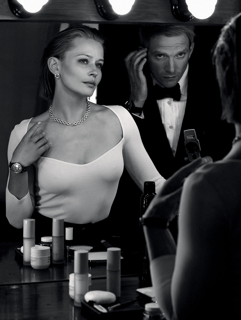 Мы встречаемся в фотостудии после съемки Юли и Андрея для Bazaar. Она хоть и немного нервно, но улыбается, он, чтобы разрядить обстановку, старается шутить. Напряжение вполне объяснимо: за день до нашего интервью разослали официальный пресс-релиз о том, что актриса вместе с режиссером Климом Шипенко отправится в космос снимать фильм «Вызов». «Даже не знаю, больше я рад или расстроился, – уже серьезно признается Андрей. – С одной стороны, кто, если не Юля? А с другой – ее долго не будет, а найти такого творческого партнера в нашей профессии, с которым ты понимаешь друг друга с полуслова, практически невозможно». Из-за предстоящей 12-дневной экспедиции на МКС Пересильд действительно придется временно отойти от дел и в кино, и в театре – в том числе и в их общем с Бурковским спектакле «Солнечная линия» в Центре имени Вс. Мейерхольда. Слишком много всего еще нужно успеть на Земле до 5 октября, на которое назначен вылет. Например, освоиться в полноразмерном макете российского сегмента международной пилотируемой орбитальной станции и поправиться на полтора десятка килограммов. «Меньше всего сейчас я хочу устроить из этой новости вечеринку. Даже дома мы особо эту тему не обсуждаем, – объясняет Юля, за последние 24 часа давшая добрую сотню комментариев прессе. – Впереди много сосредоточенной работы и сплошных экспериментов: еще никогда никого не готовили к космосу за четыре месяца». К счастью, стратегического запаса премьер у актрисы хватит, чтобы заполнить возникшую паузу. Только с Андреем на двоих – три новых проекта.