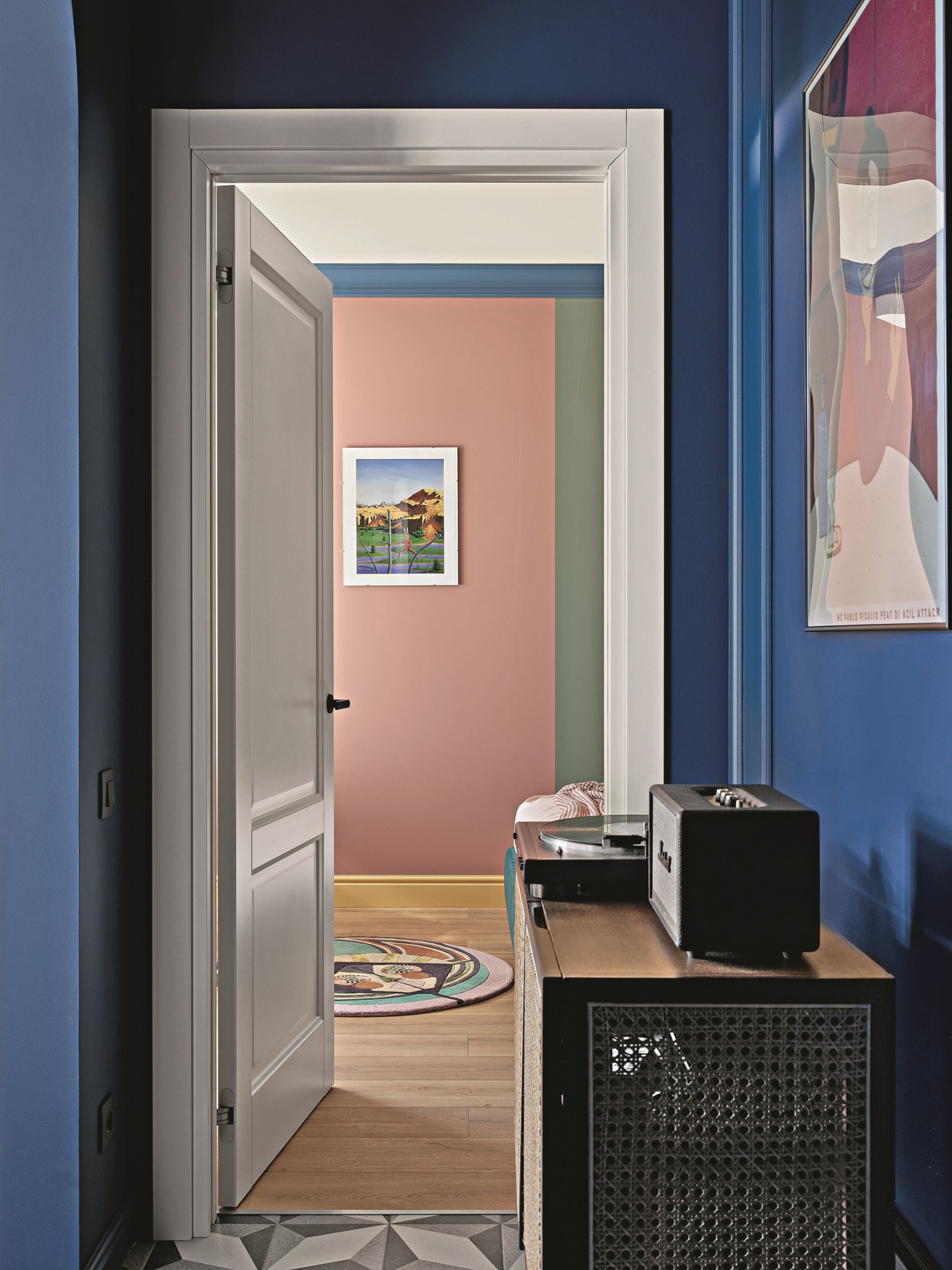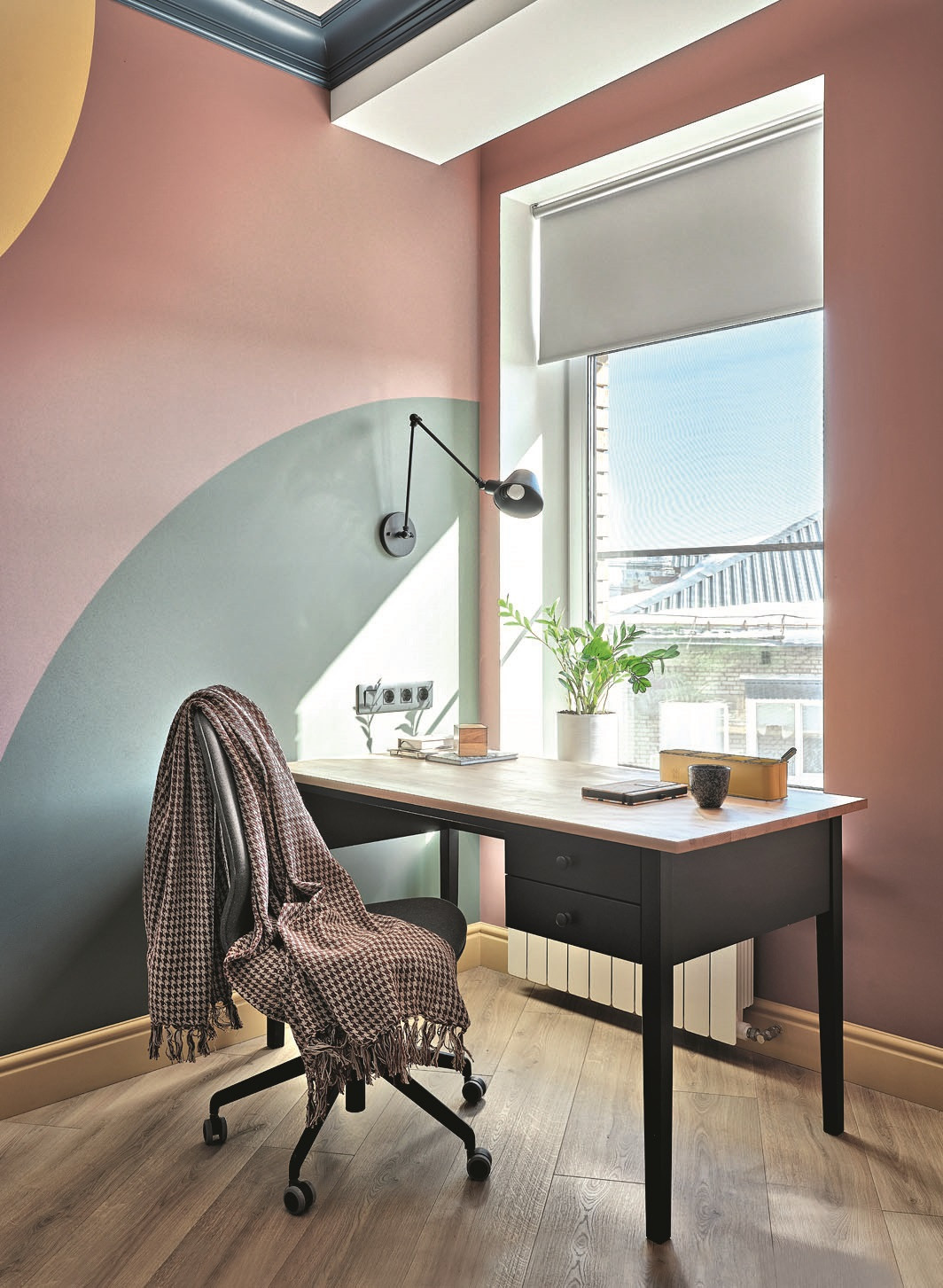 Заказчики сразу обозначили предпочтения: «В белом интерьере мы уже пожили. Теперь хотим яркий и цветной». Что касается стиля, выбрали эклектичный интерьер с элементами mid-century — стиля середины ХХ в. Отсюда характерные для эпохи цвета, мягкие формы мебели, геометрические принты, плитка в духе терраццо, современное искусство. И действительно, здесь есть ощущение стильной и современной квартиры и при этом — квартиры с историей. Кроме того, хозяева попросили дизайнера спроектировать для них спальню с рабочим местом, так как они часто работают из дома, причём спальню и детскую расположить подальше друг от друга. Решили, что, поскольку дети одного пола и с небольшой разницей в возрасте, достаточно будет одной детской. К тому же была необходима просторная кухня-гостиная, так как в доме часто бывают друзья. Отдельным пунктом шли системы хранения, поэтому в проекте предусмотрели гардеробную при спальне, большой встроенный шкаф в прихожей и хозблок — для стиральной машины, гладильной доски, пылесоса, парогенератора. Хозблок спрятан во встроенном шкафу, напротив входа в квартиру.