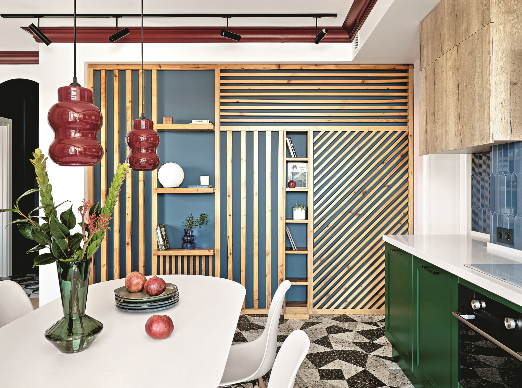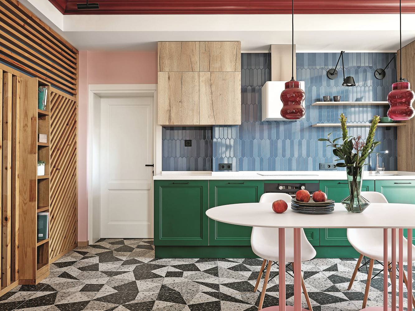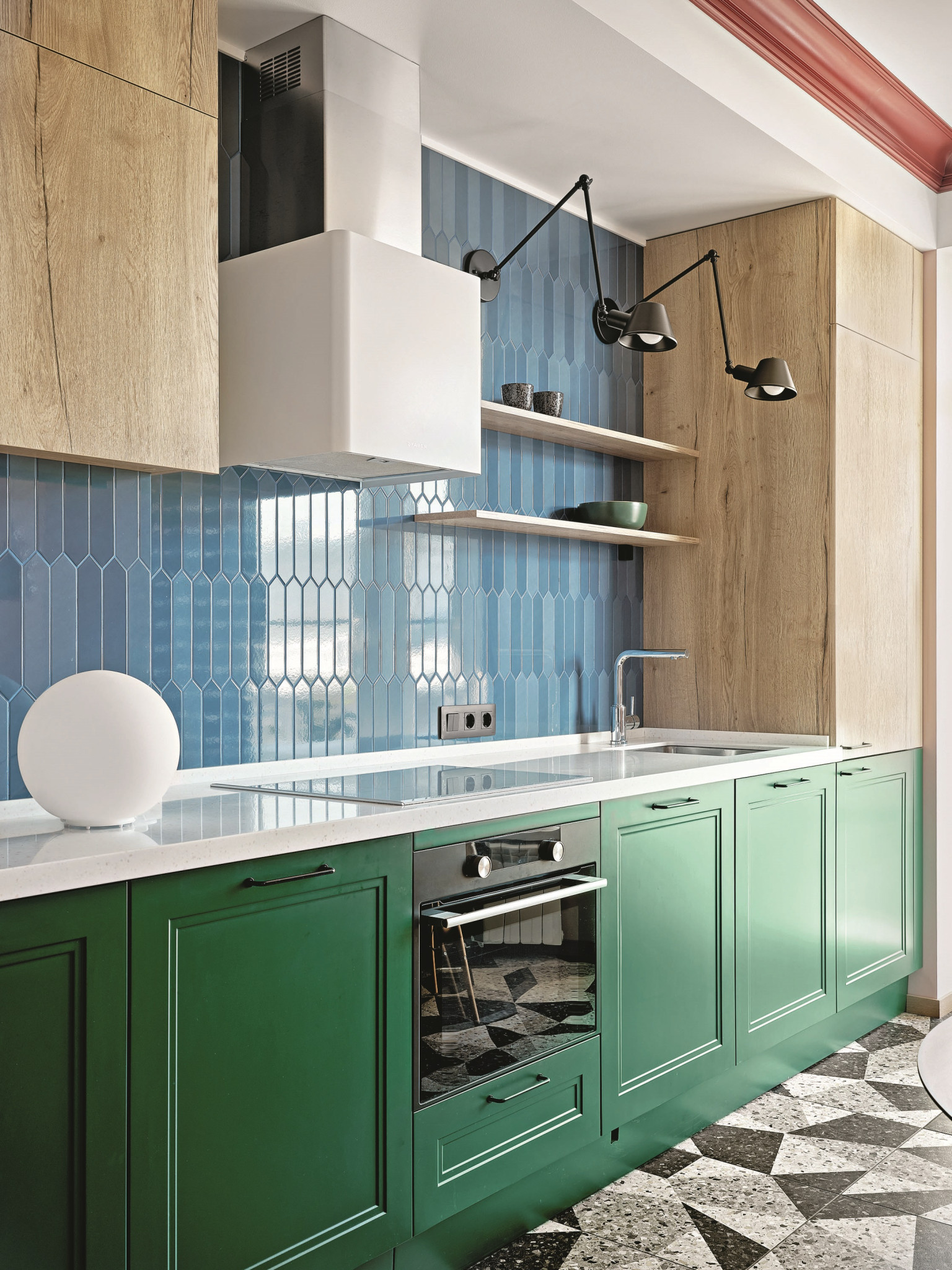 Заказчики — друзья моих друзей и сами творческие люди, поэтому работать над этим проектом было большим удовольствием. Интересный факт: мы не делали для этого проекта 3D-эскизы, так как заказчики — люди с визуальным мышлением и развитым воображением. Они были готовы воспринимать информацию в двухмерном изображении, в формате коллажей. Хозяева без труда представляли, как решение, поданное на плоскости, будет выглядеть в пространстве, к тому же они полностью доверились мне. Так было и с кухней. Я предложила сделать кухню в любимых оттенках стиля mid-century — синем и зелёном, сочетая их с нежно-розовым цветом стен и оттенками натурального дерева. Чтобы добавить пространству лёгкости, не стали использовать много верхних шкафов, предпочли открытые полки. При этом у нас была задача спрятать вентшахту, и мы её скрыли в подвесном шкафу из МДФ с отделкой под дерево. Из этого же материала сделан шкаф под холодильник. В итоге между ним и вытяжкой образовалась уютная ниша, в которой мы разместили полки.