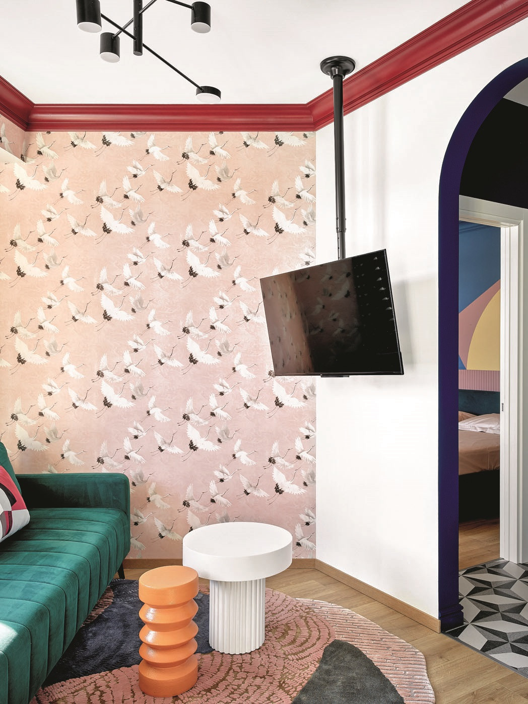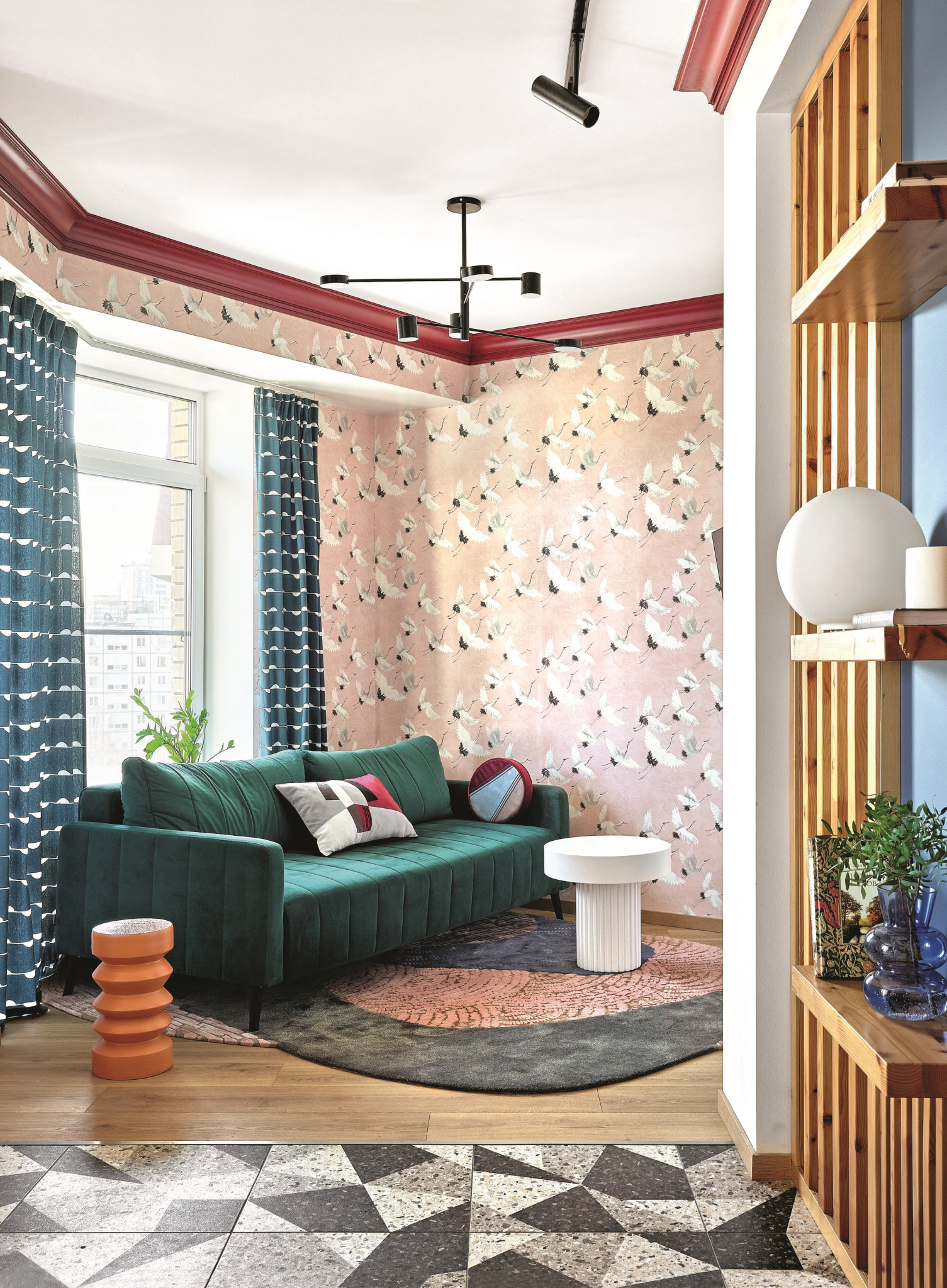 - Стены: краска Little Greene, обои с журавлями Aura East West Style 24305