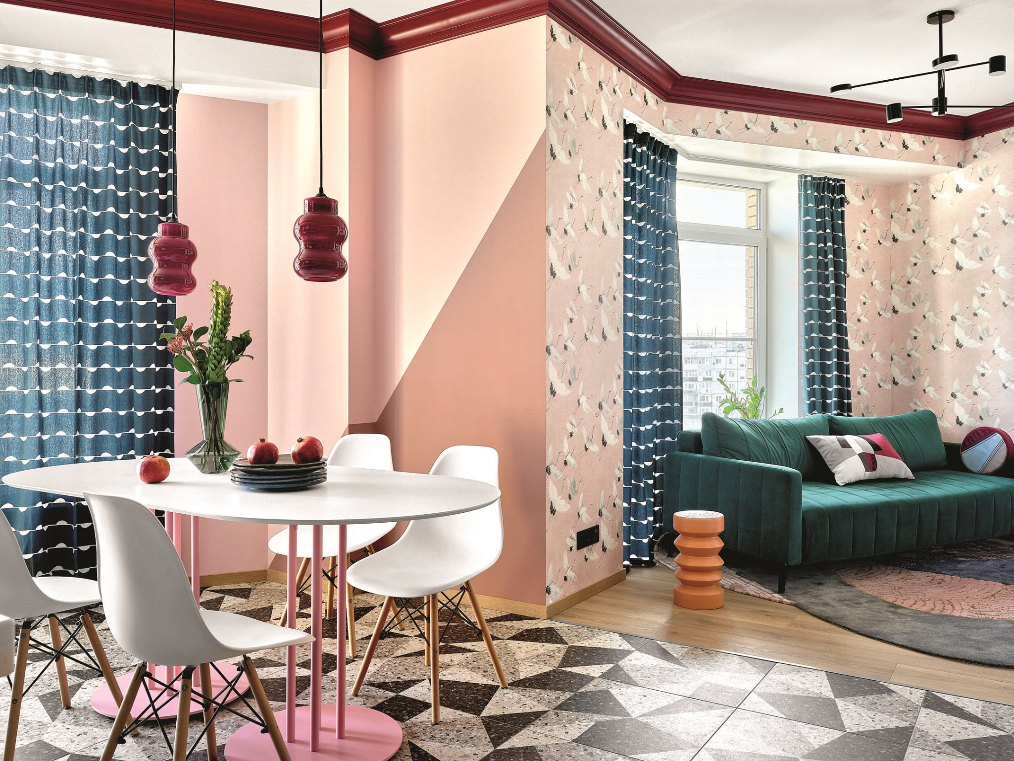 Эта необычная, очень солнечная по настроению квартира находится в Нижнем Новгороде, в новом жилом комплексе «Дом на Провиантской», а живут здесь молодые супруги с двумя маленькими дочками. Хозяева работают в сфере графического дизайна, поэтому в интерьере своей квартиры вместе с дизайнером с удовольствием экспериментировали с оттенками и принтами. Срок реализации проекта — около года.