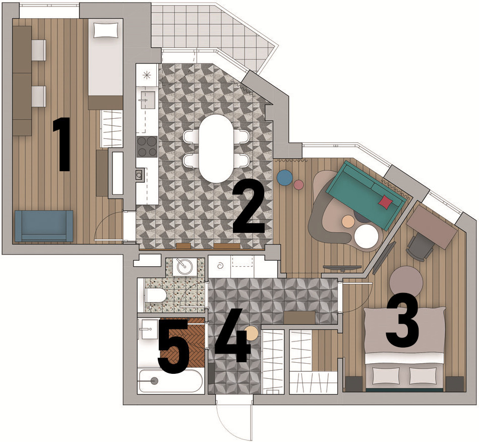 Перепланировка. Изначально планировка была свободная, без перегородок, кроме детской (прямоугольное помещение в левой части плана) и санузлов. Присутствовали также две бетонные колонны: одна у стены, а другая в центре квартиры — и массивные бетонные балки вдоль всех окон. У квартиры сложная форма: фасадная стена скошена под углом 45˚. Пространство ломаной формы надо было сделать более гармоничным, что и удалось за счёт простого и гениального решения: между нынешними спальней и гостиной поставили перегородку под углом 90˚ к фасаду, а другой перегородкой разделили прихожую и гостиную. В результате перепланировки центральная бетонная колонна «ушла» в эту перегородку и стала совершенно незаметной. Также появилась зона гостиной, где разместили диван и журнальный столик. Перепады фасада оказались таким образом обыграны как дополнительные возможности разделения гостиной и столовой.