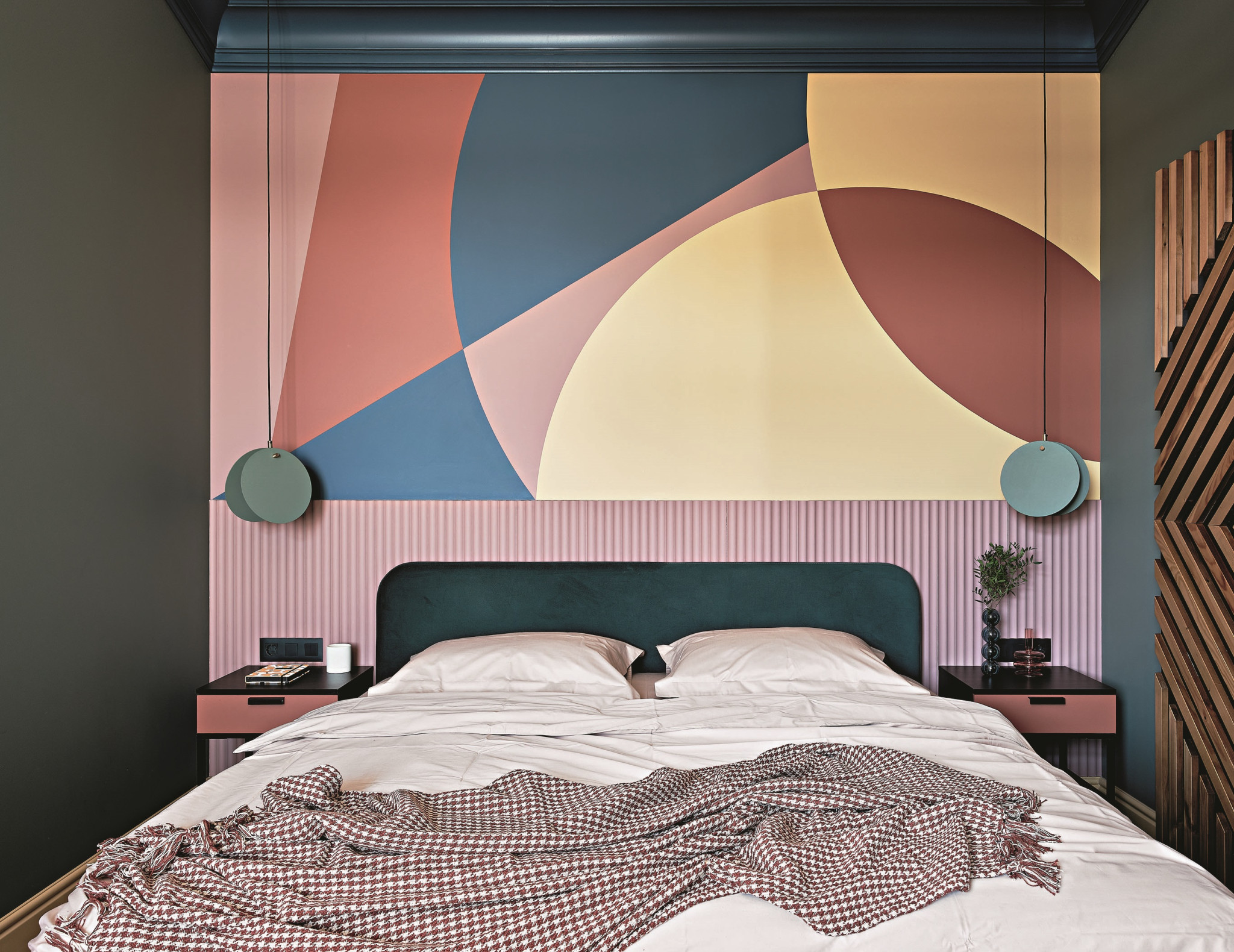 Ремонт. Стяжка была от застройщика. Окна, радиаторы и подоконники — тоже. В ходе ремонта поменяли подводку к радиаторам на скрытую. Часть перегородок сделали из силикатных пазогребневых блоков (у них хорошие звукоизолирующие свойства, что важно, когда в доме есть дети), остальные, где проходят коммуникации, — из ГВЛ и ГКЛ. Стены оштукатурили, покрыли шпатлёвкой, наклеили строительный флизелин и нанесли ещё слой шпатлёвки. Затем стены окрасили, используя в некоторых помещениях приём колор-блок. Так, в изголовье спальни рабочие создали красочное панно по эскизу дизайнера. В зоне гостиной стены оклеили обоями с орнаментом — это помогло дополнительно акцентировать её в открытом пространстве. Потолок с помощью ГКЛ опущен минимально, только для выравнивания. Кроме зоны над кухней — там опустили потолок под вентканал: от вытяжки к вентотверстию. Поскольку стояла задача вписаться в определённый бюджет, то в отделке использовали много бюджетных брендов. Например, на полу ламинат под дерево Parador, в зоне кухни — керамогранит под терраццо от «Керамин» (бюджетный, но смотрится очень эффектно). В прихожей — испанский керамогранит PAMESA, в санузлах — керамогранит под терраццо APE CERAMICA. Заказчикам очень хотелось задействовать в интерьере деревянные рейки — так появилась стена из реек в гостиной: частично она работает как стеллаж. Похожим образом оформлена дверь в спальне — сдвижная, на скрытой направляющей (она ведёт в гардеробную). Они изготовлены на заказ в столярных мастерских Нижнего Новгорода. В квартире два балкона, но они небольшие — «курительные». Там кованые перила от застройщика и цветы в тёплое время года.