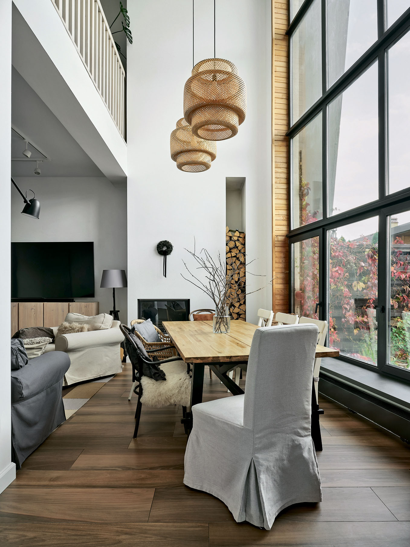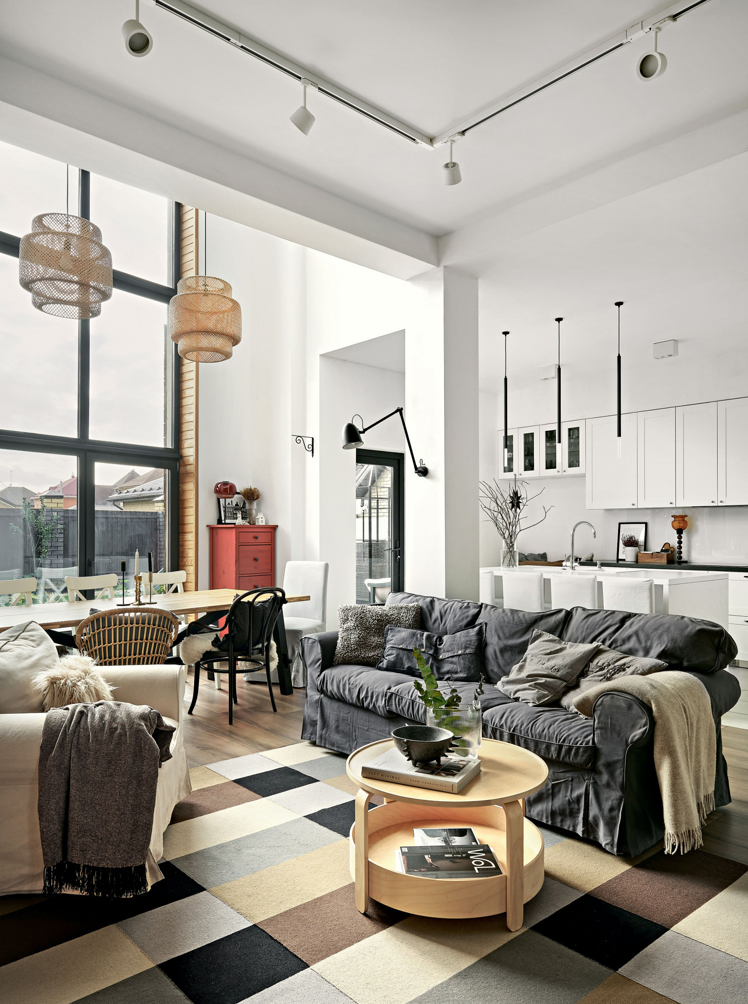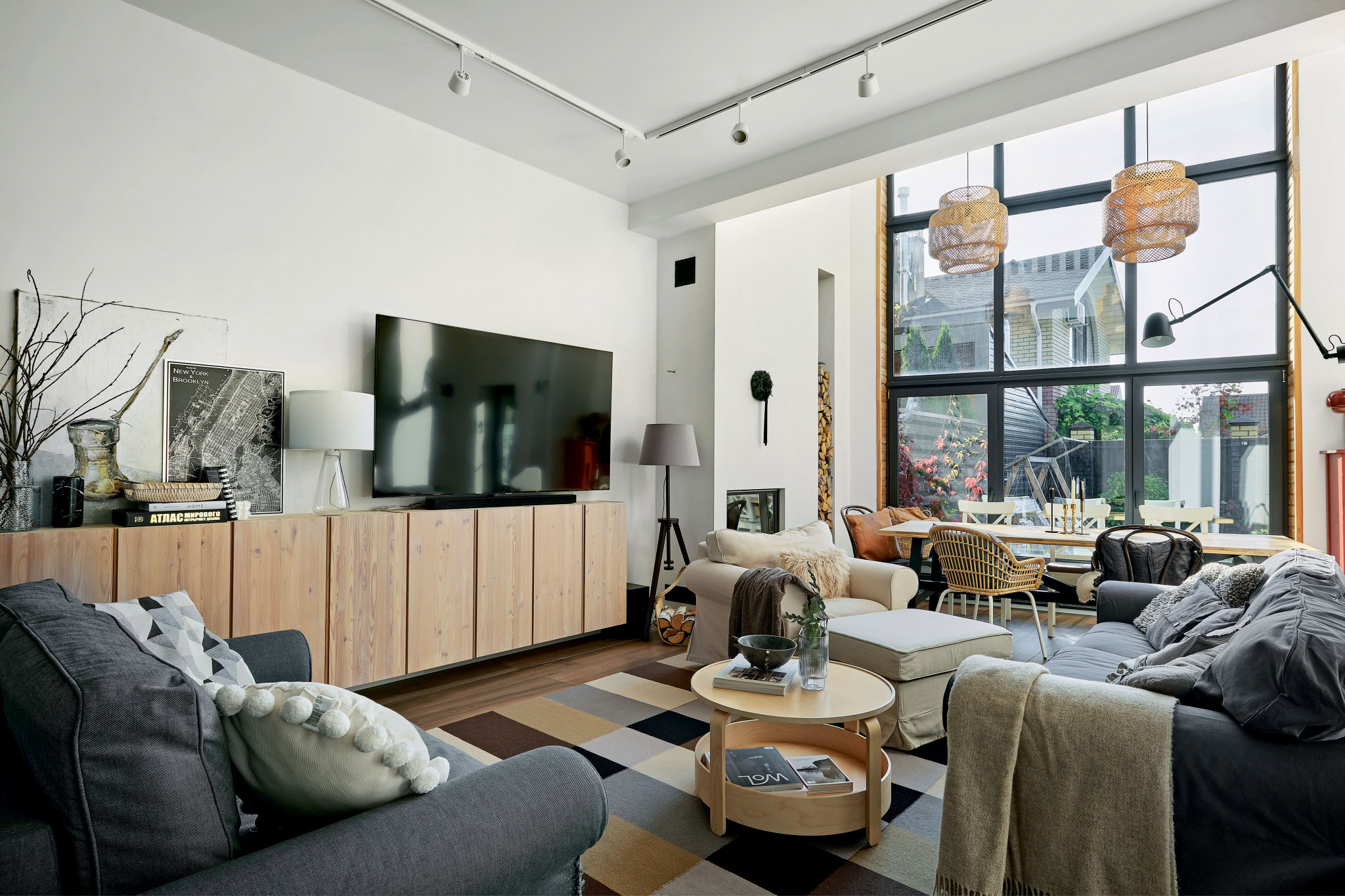 Панорамные окна и второй свет продиктовали планировочное и стилистическое решение общей жилой зоны — студийное пространство с элементами скандинавского стиля
