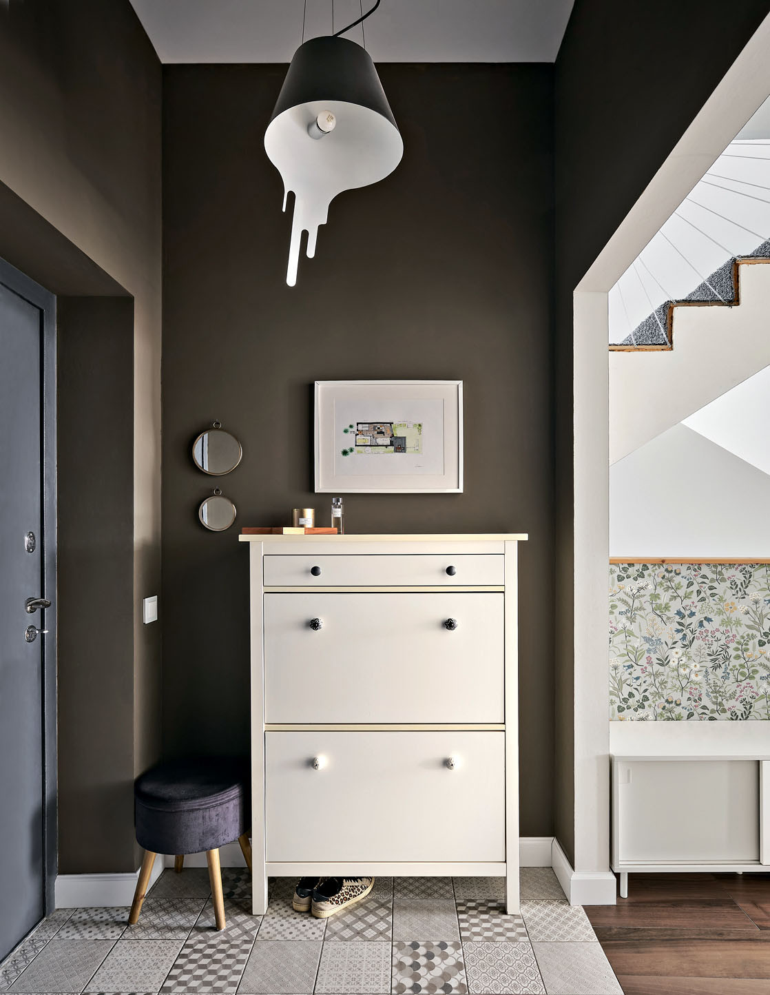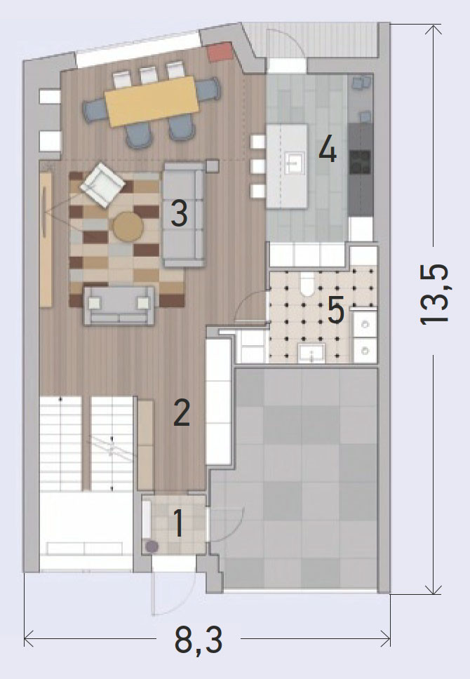 Семья с тремя детьми приобрела секцию в таунхаусе в пригороде Тюмени для постоянного проживания. На решение о покупке повлияла современная архитектура здания. За счёт панорамного остекления и высоких потолков днём внутреннее пространство буквально заполняется естественным светом. Супруги (муж по специальности инженер-проектировщик, жена — дизайнер) по достоинству оценили возможности планировки и с вдохновением занялись разработкой дизайн-проекта.