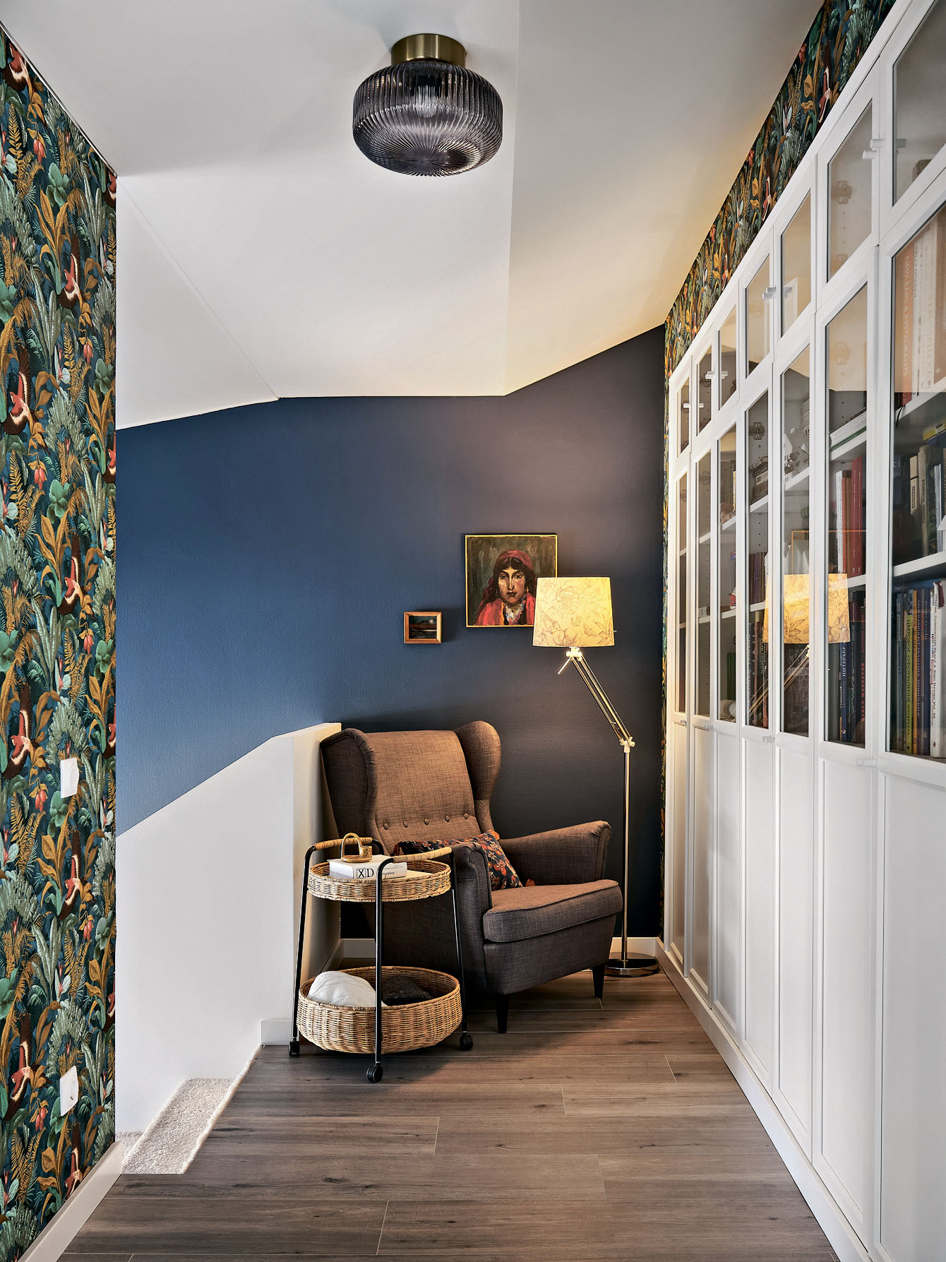 Ограждение лестницы выполнено необычным способом — из гипсокартона на металлическом каркасе. Эксперимент можно считать удачным. Расчётной прочности конструкции достаточно для функции перил, а, в отличие от традиционных балясин, сплошное ограждение не провоцирует детей просунуть ногу или голову между стойками. Ухаживать за материалом несложно благодаря покрытию моющейся краской. Дизайн воспринимается деликатно и легко. Напоминает оригами в увеличенном размере — фигурки из бумаги, искусство создавать которые пришло из Японии и полюбилось многим взрослым и детям.