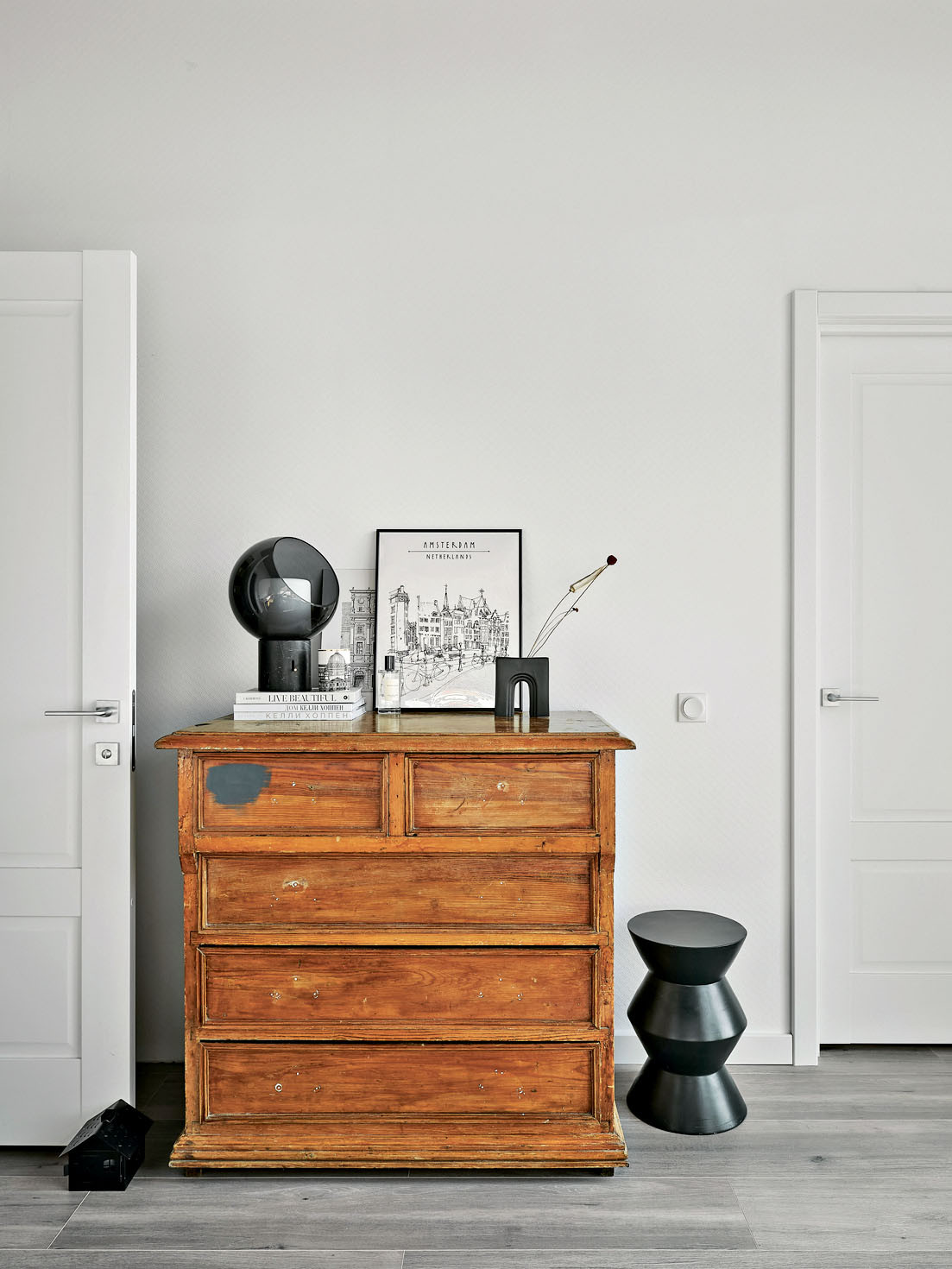 Современную обстановку мы со временем планируем дополнять винтажными предметами. Они создают атмосферу дома, семьи с историей. Сейчас в интерьерах у нас задействована всего пара старинных вещей. В спальне расположился бабушкин комод. Несмотря на то что он выглядит довольно пожившим и нуждается в реставрации, это памятный предмет, рождающий волну воспоминаний. Я пыталась найти подходящие ручки на смену совсем облупившимся старым, но в итоге прижилось именно такое состояние комода — без ручек. Это добавляет ему некой отстранённости и делает акцент на декоративной функции.