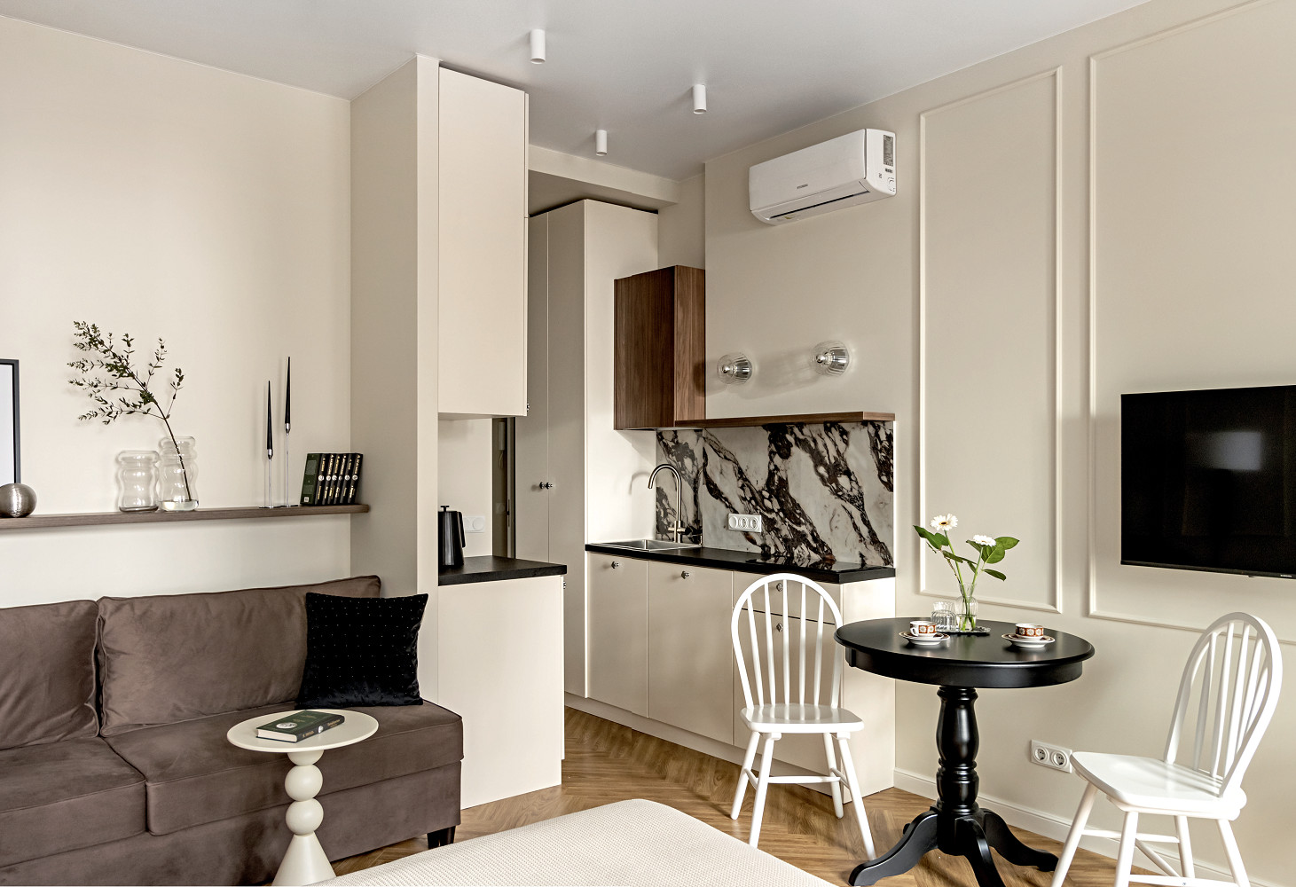 Локация в исторической части города подразумевала, что в квартире будут жить туристы. На небольшой площади требовалось расположить всё необходимое для комфортного пребывания: двуспальную кровать с матрасом шириной 160 см, дополнительное спальное место, места хранения и кухню с техникой.