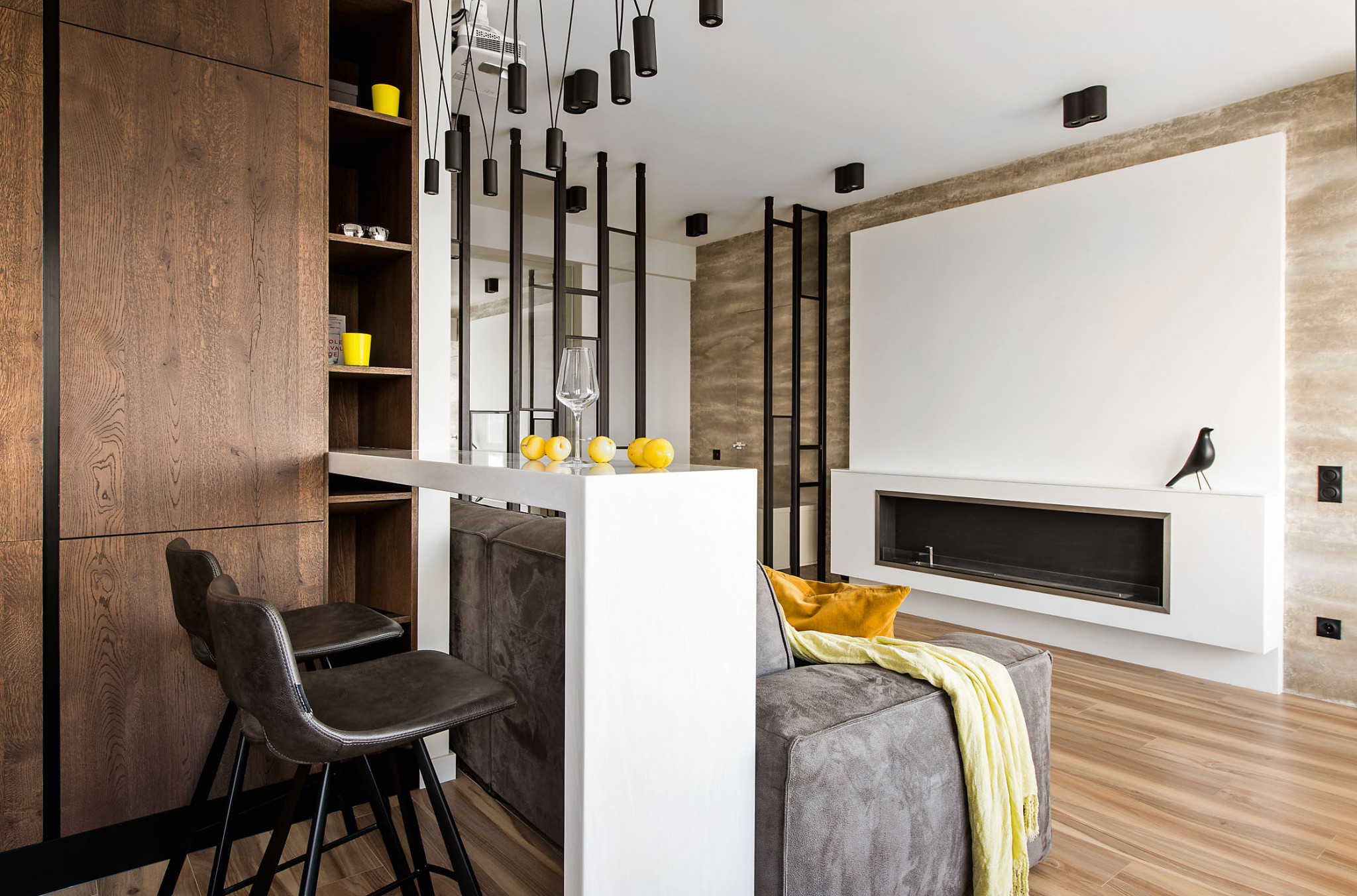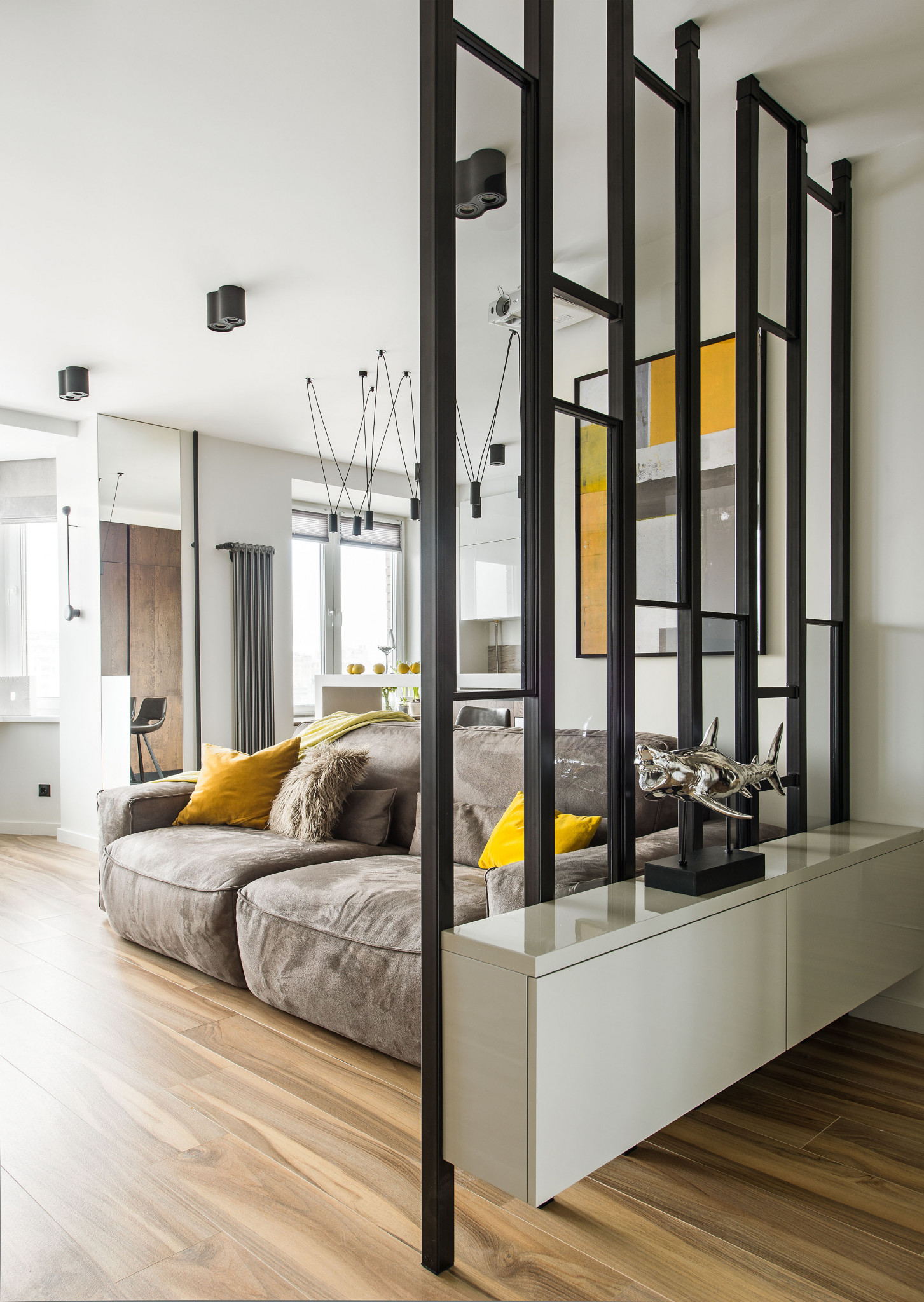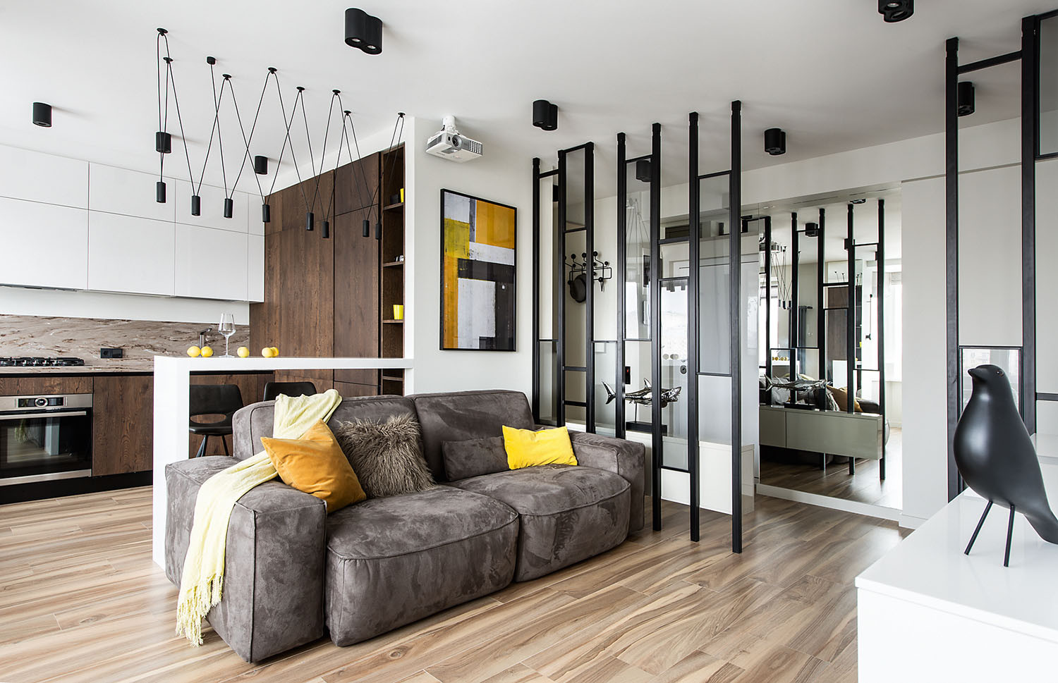 Графичность, которую придают интерьеру перегородка из реек и светильник на подвесахстержнях, смягчают диван в велюровой обивке и паркетная доска с живой текстурой.