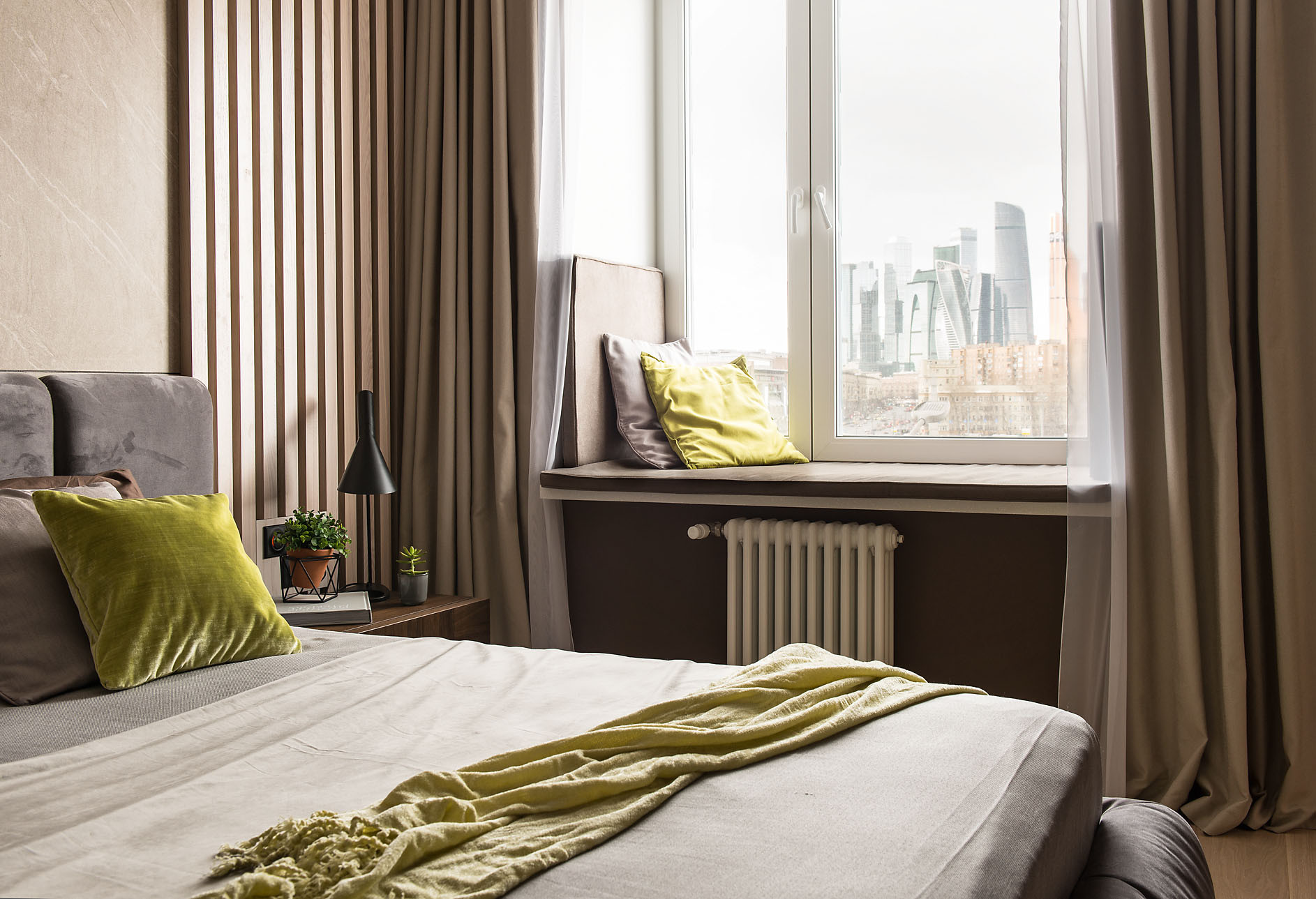 - Мебель: кровать — на заказ, прикроватные столики Rossetto armobil, подоконник-лавка — на заказ (Staron, «Ориан»), комод — на заказ («Креативный Взгляд»)