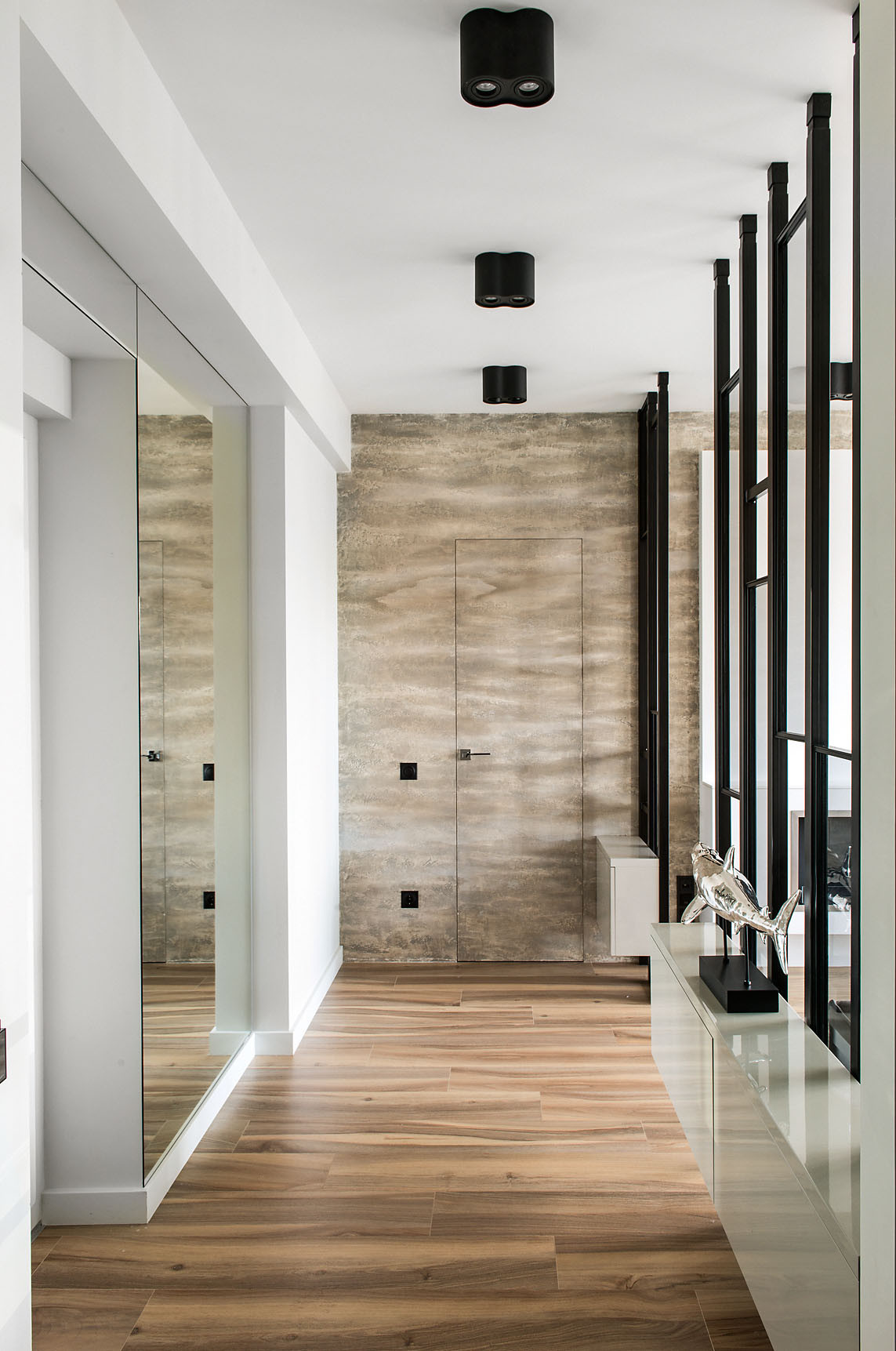 Владельцу хотелось впустить как можно больше живого света в прихожую, и между студией и входной зоной соорудили перегородку из стекла на металлокаркасе, а напротив к стене прикрепили огромное зеркало, улавливающее отражение окна и углубляющее перспективу. Выступающий ригель, портивший облик этой стены, включили в объёмную композицию, созданную с помощью гипсокартона, — получилось подобие портала, придавшего всей конструкции архитектурную завершённость.