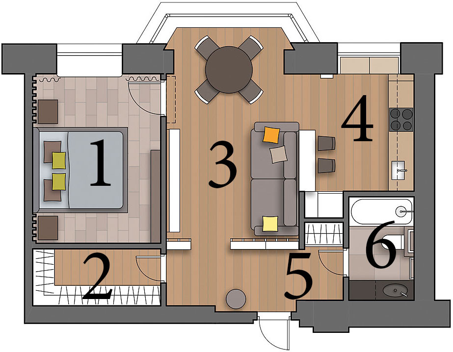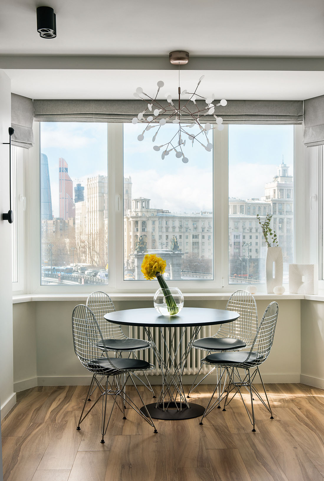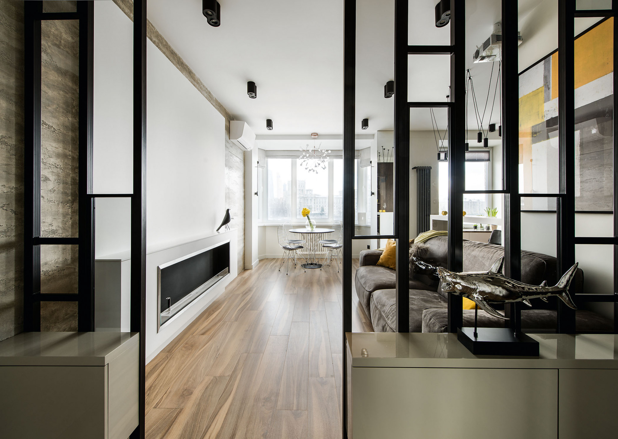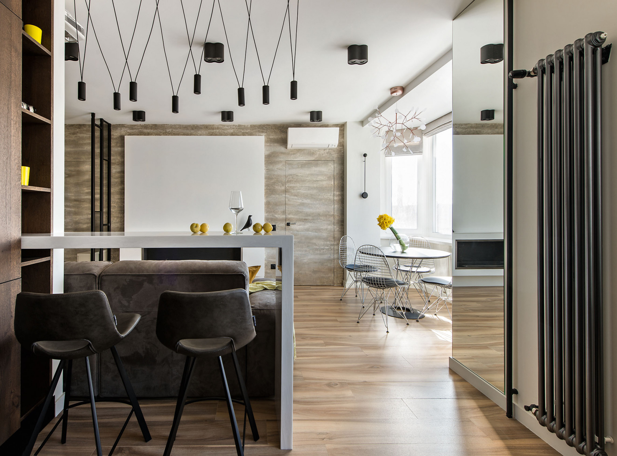 Дизайн. Современный урбанистический облик интерьера соединил приметы минимализма и функционализма, но с узнаваемыми, присущими лишь этому проекту чертами. Окна стали главными точками притяжения взгляда, и их не стали скрывать за шторами. Рискованное объединение четырёх зон (гостиной, столовой, кухни и прихожей), обычно упрощающее облик интерьера, в данном проекте элегантно уравновешено различными способами зонирования: разделяющим звеном между гостиной и кухней служат барный стол и спинка дивана, гостиную от прихожей частично отделили перегородки — две вертикальные металлические решётки с прикреплённым к ним стеклом. Лёгкий ритм их вертикалей как бы собирает невесомое пространство, пронизанное светом, и перекликается с такими графичными деталями, как необычная люстра с множеством плафонов на тонких диагоналях тросов, вытянутый трубчатый радиатор. Сдержанная цветовая гамма объединила решения всех зон и комнат.