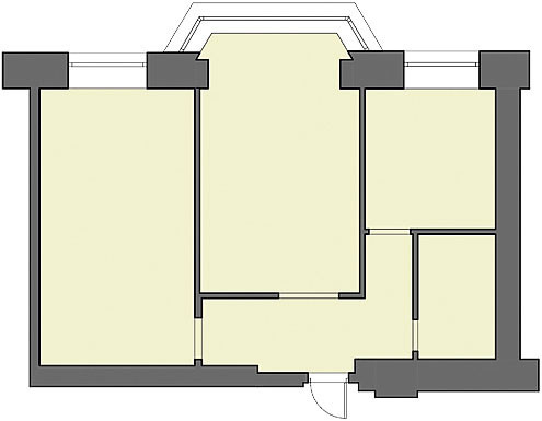 Перепланировка. Вытянутый прямоугольник двушки прежде имел практически симметричную планировку — ось симметрии проходила по трёхгранному, с небольшим выступом эркеру. Старая структура не годилась для сценария жизни владельца, лишь зоны кухни и санузла остались на прежних местах. Кухню и гостиную объединили, от прихожей отделив не стеной, как прежде, а прозрачной перегородкой, границу между входной зоной и кухней чуть сместили, чтобы встроить мебель с обеих сторон. Сократив длину спальни, устроили гардеробную с отдельным входом из прихожей. Ванная осталась в прежних границах.