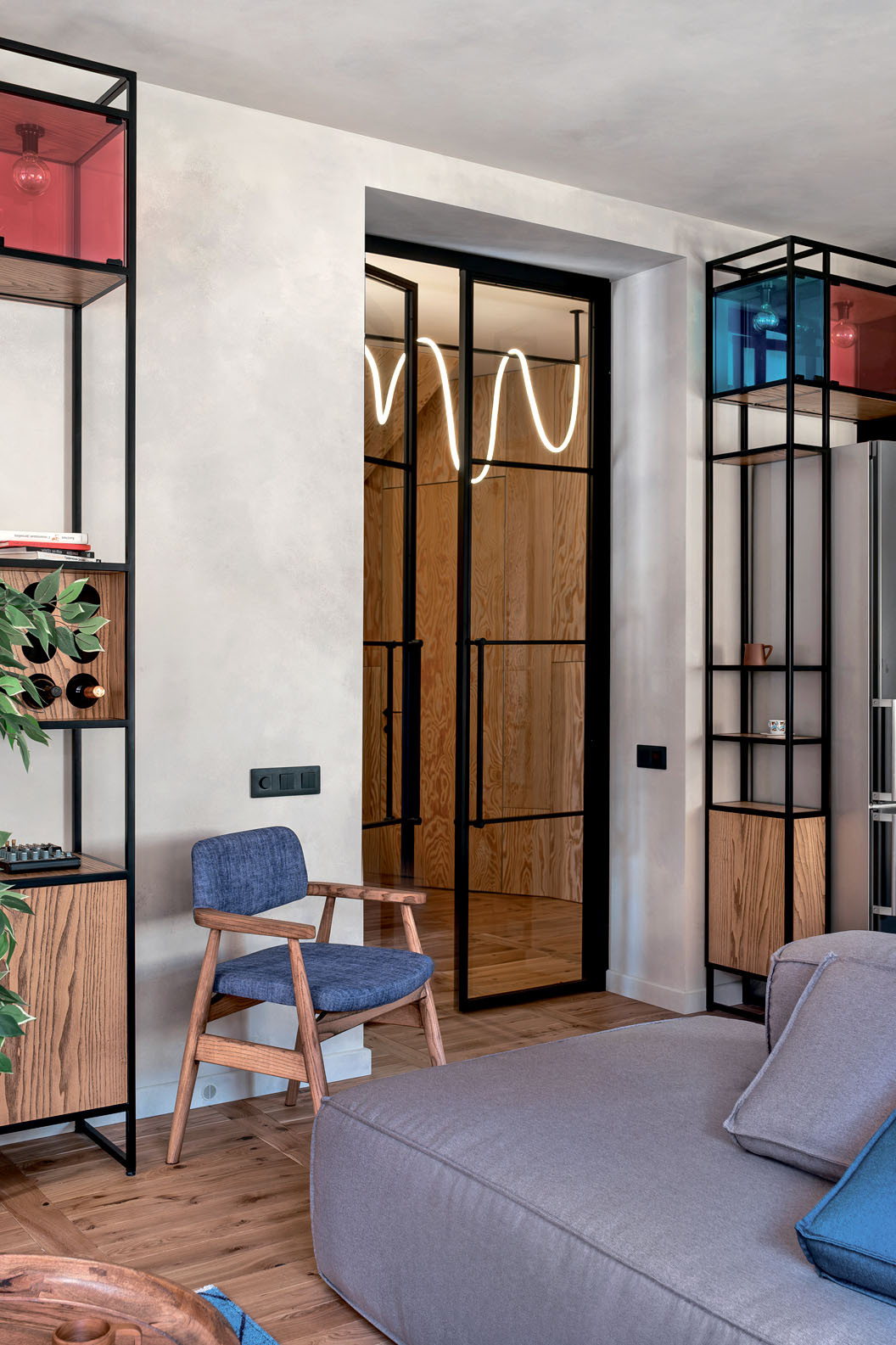 По ходу ремонта были выявлены проблемы с электрикой, отоплением и качеством стеклопакетов. В одних комнатах радиаторы не прогревались должным образом, в других, наоборот, было жарко и душно. Стало понятно, что малой кровью обойтись не получится, придётся переделывать все системы инженерных коммуникаций. С этого момента реконструкция проходила специфически. Проектирование продолжилось, при этом параллельно уже шли ремонтные работы. Под авторским надзором очерёдность всех процессов была соблюдена, но времени потребовалось больше. За демонтажом последовали прокладка коммуникаций, установка закладных деталей и дверных коробок под двери скрытого монтажа. Затем шли грязные штукатурные и плиточные работы, устройство потолков, отделка стен, укладка полов. На заключительном этапе установили сантехнику, встроенную мебель, раздвижные перегородки, повесили светильники. Нюансов было очень много.