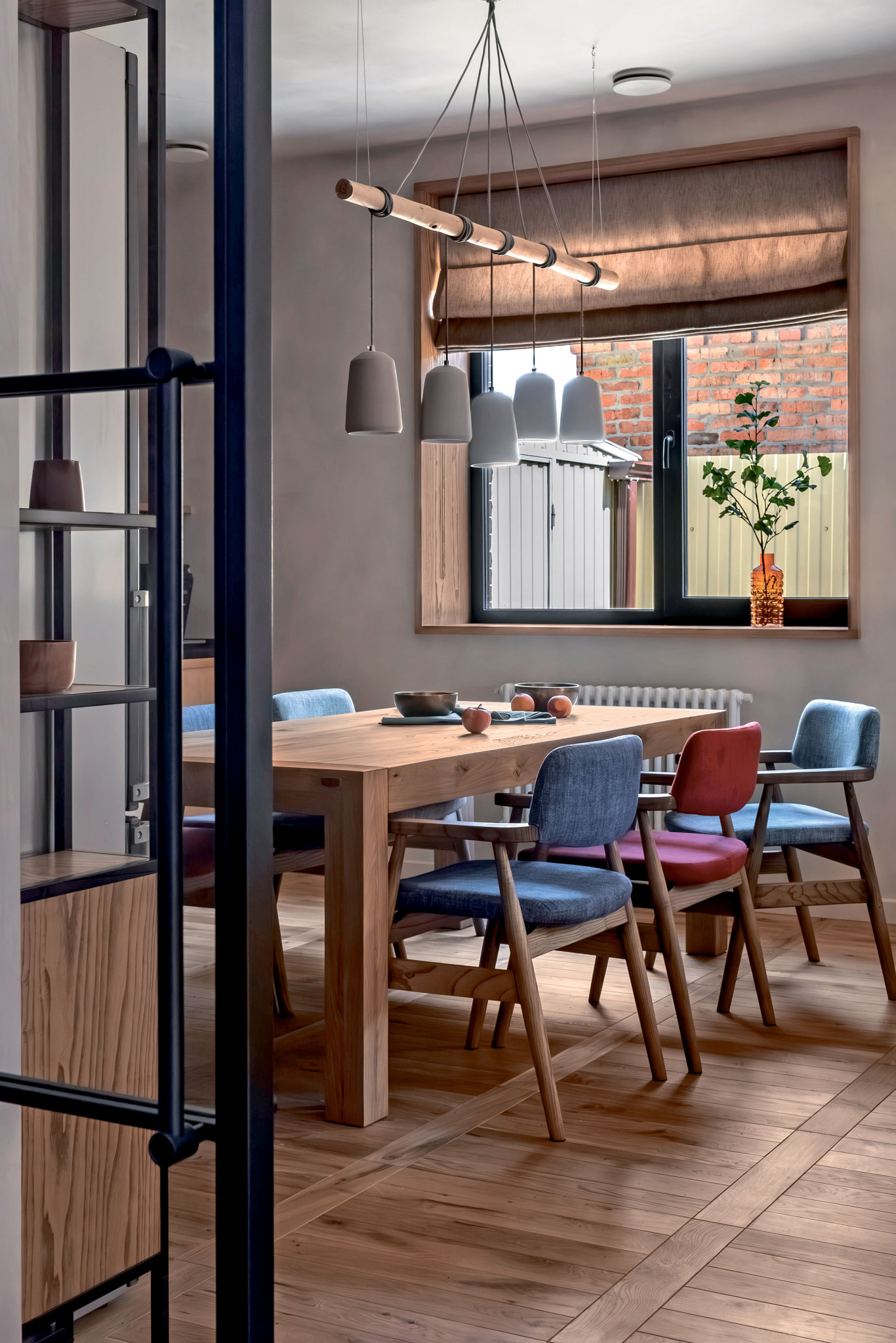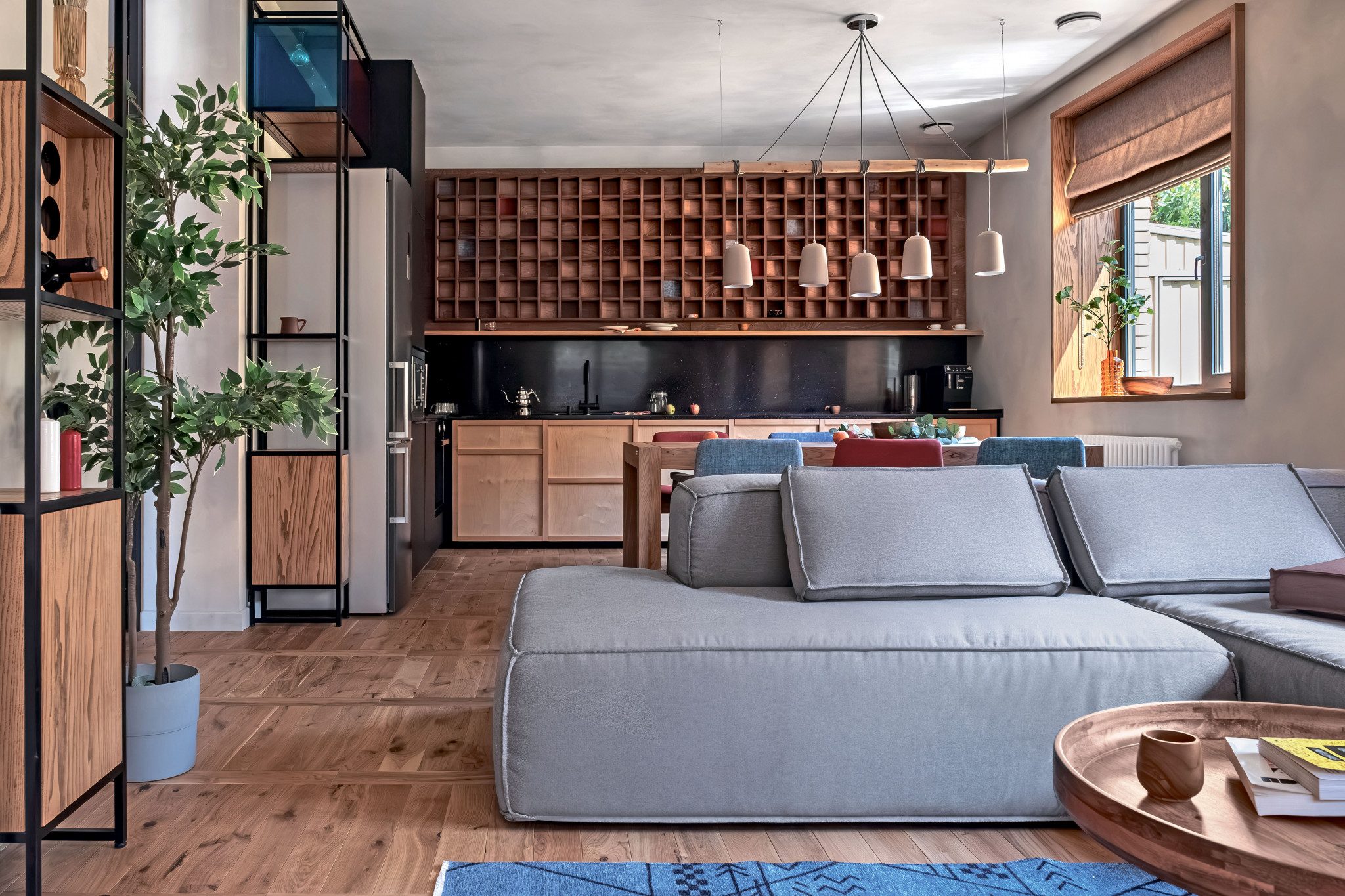 Хозяин дома увлекается музыкой. Для улучшения акустики в интерьер требовалось вписать звукопоглощающие поверхности. В результате дизайнер встроил в интерьер акустический диффузор. Ячеистую конструкцию из берёзовой фанеры разместили над кухонной зоной, на противоположной от источников звука стороне. Благодаря яркой авторской идее необычный функционально-декоративный элемент вписался на отлично. Цветом, дизайном и материалом исполнения он сочетается с другими предметами обстановки.