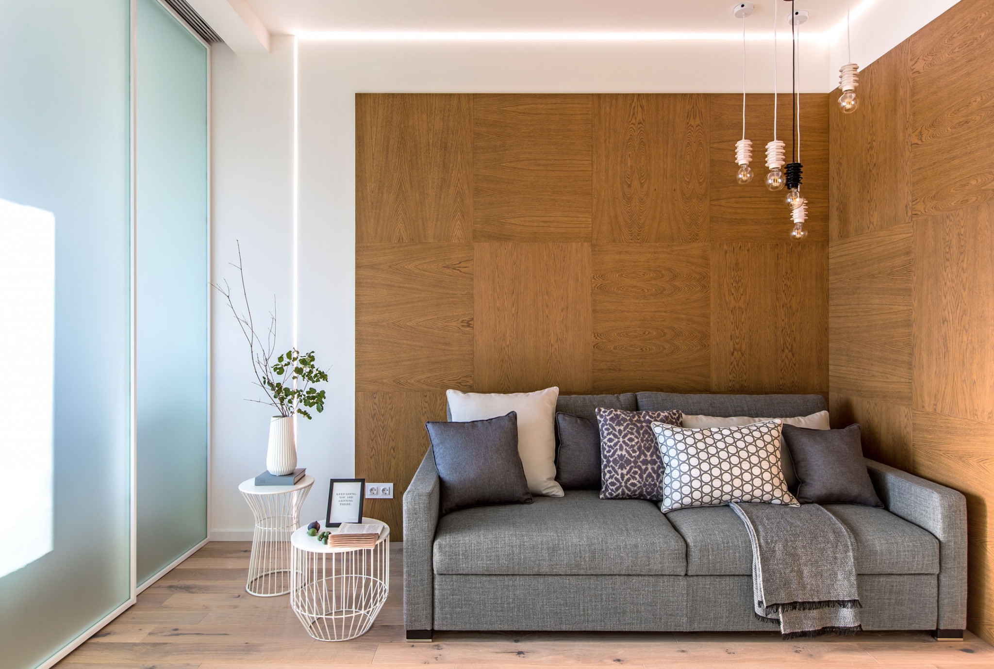 Ремонт. Стяжка, которую выровняли в один уровень с порожком, заняла 10 см. Почти во всех помещениях уложили экологичную инженерную доску, а в душевой, рабочей зоне кухни и прихожей в качестве напольного покрытия выступил керамогранит. Потолки опустили только в зонах, где необходимо было проложить коммуникации: воздуховоды, пожарные датчики, трубы кондиционирования, а также спрятать карнизы для штор. Большинство стен окрасили белой моющейся краской, а часть поверхностей в зоне гостиной отделали панелями из шпона дуба. Окна были установлены застройщиком, но при сдаче дома обнаружились царапины, которые пришлось аккуратно заретушировать. Щитки смонтировали слева от входа и закрыли дверцами из специально изготовленных