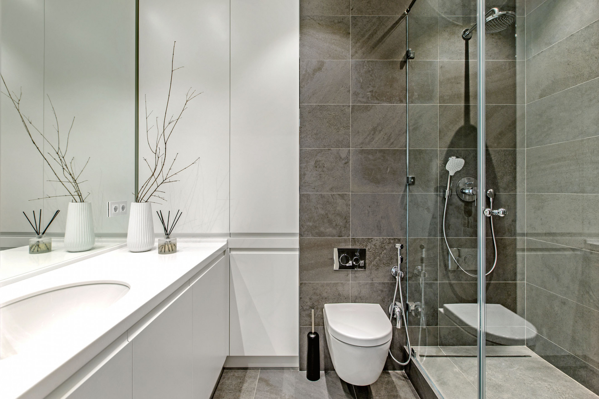Перепланировка. Квартира в новостройке представляла собой бетонную коробку без внутренних перегородок, что позволило чётко спланировать расположение необходимых зон в малогабаритном пространстве. Справа от входа удалось выкроить место для гардеробной, напротив — разместить душевую. Остальные возведённые перегородки выполняют не только зонирующую функцию между приватной и общественной территорией, но и образуют ниши для встроенных шкафов. Балкон решили не присоединять, а утеплить и оборудовать конвектором.