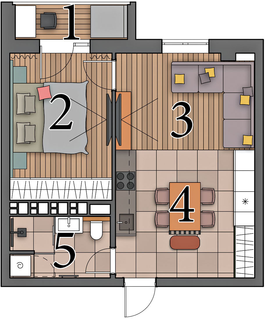 Перепланировка. Основные функциональные задачи, которые предстояло решить в данном интерьере, сводились к удобству проведения досуга с друзьями за настольными играми и плэйстэйшен, а также к необходимости создания отдельной спальни. Конфигурация квартиры позволила реализовать задуманное оптимальным образом: выделить кухню-гостиную с частично отгороженной входной зоной и отдельную спальню. Место санузла было определено расположением стояков и окон. Кроме того, в присоединённой лоджии удалось сделать полноценный рабочий кабинет: её утеплили и среди прочего оконный блок заменили на новый с коэффициентом сопротивления теплопередаче, близким к единице.