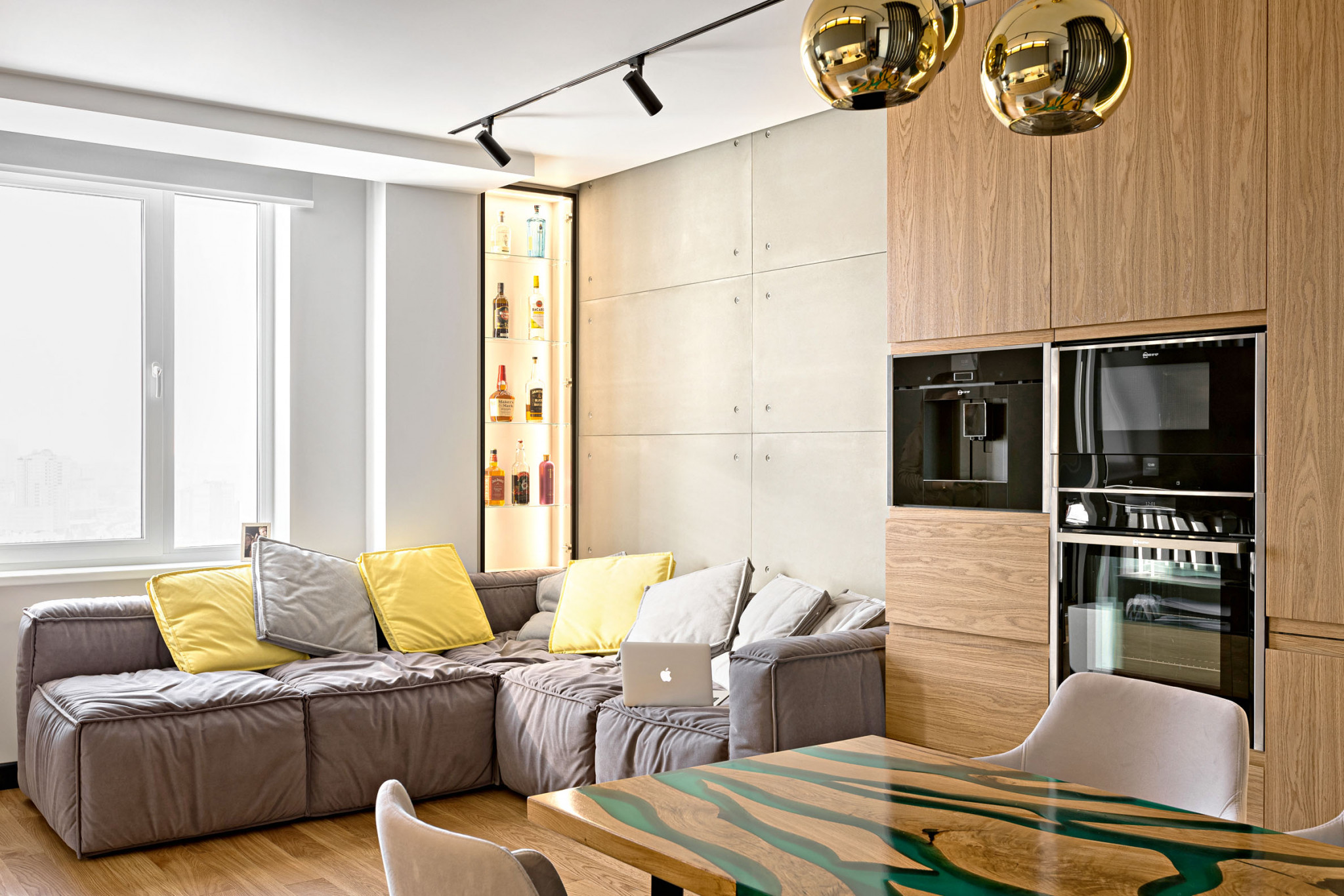 Дизайн. Современный интерьер квартиры сочетает в себе элементы лофта (бетонные панели за диваном, трековые системы освещения, плитку под бетон в душевой и кухне) и экотемы. В отделке использованы простые материалы максимально натуральных, природных оттенков (шпон дерева, бетон, камень).