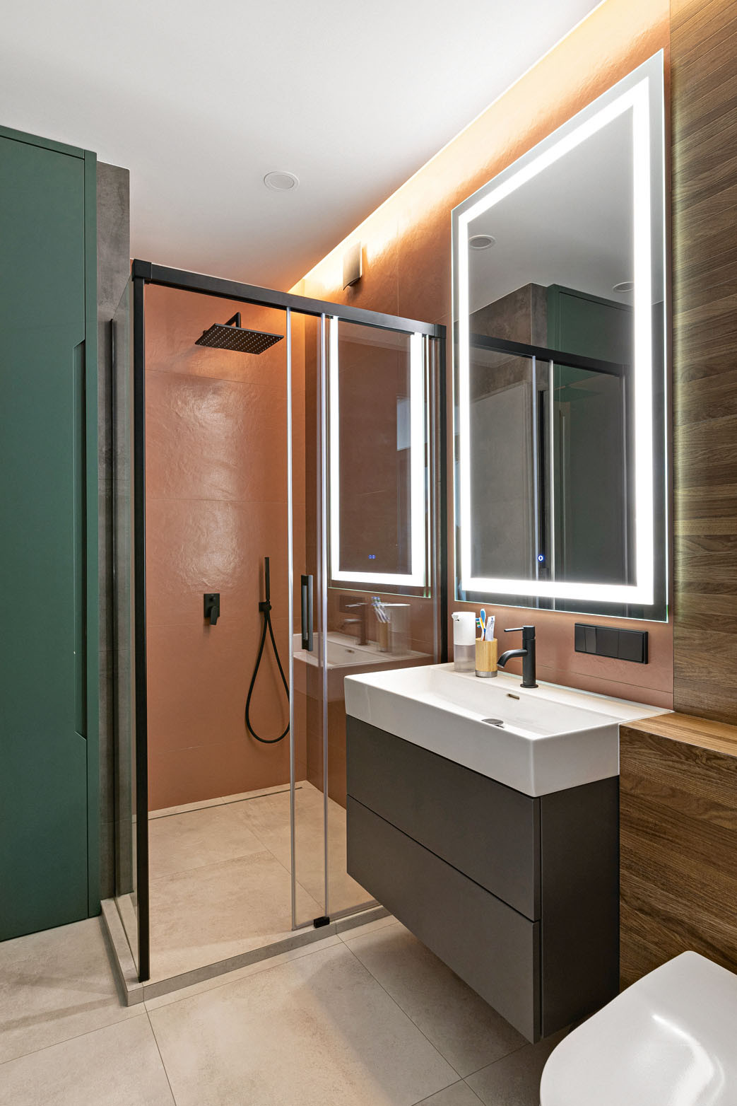 Чтобы создать оптимальное освещение, архитектор продумала каждую «историю», которую заказчик будет проживать в квартире. Для каждой зоны получилось своё, особенное решение. В санузле, например, лишённом естественного света, его аналогом стала тёплая, как бы вечерняя, расслабляющая (цветовой температуры порядка 3500 К) рассеянная подсветка. Источник — светодиодные ленты — расположен под подшивным потолком. Кроме своего прямого назначения подсветка удачно оттеняет отделку тёплых тонов. Зеркало над раковиной дополнено встроенной по периметру светодиодной подсветкой типа гримёрной, не отбрасывающей теней, которая характеризуется холодным светом (цветовой температуры порядка 6000 К). Как известно, холодный свет бодрит, что важно для начала удачного дня.