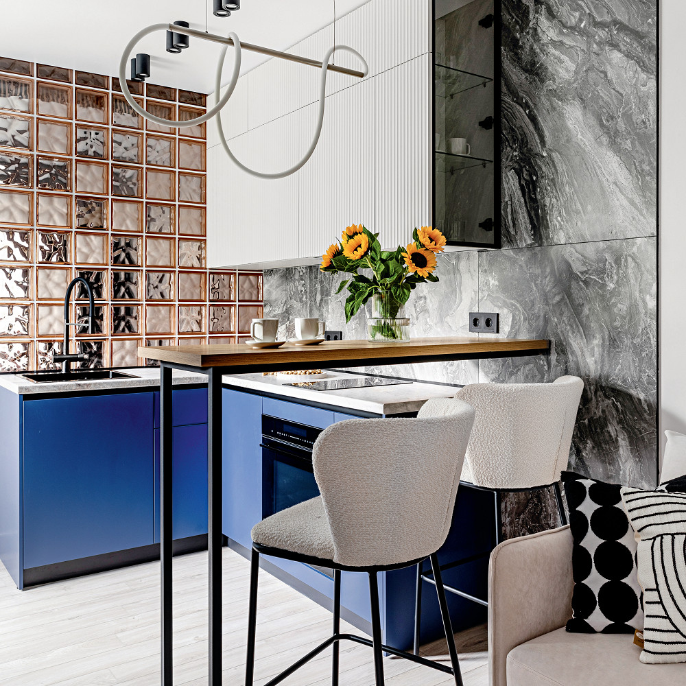 Квартира у моря рассматривалась как для личного проживания, так и для сдачи в аренду. Поэтому было важно эффективно использовать каждый квадратный метр её небольшой площади. В интерьере сохранена морская тематика, которая проявляется в цветовых сочетаниях синего и оранжевого, как метафора к скользящим по волнам алым парусам.