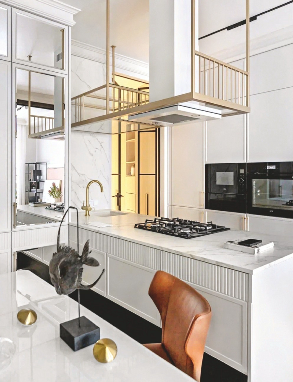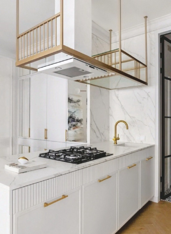 Изначально квартира имела сложную планировочную структуру — помещения неправильной формы, нестандартные пропорции комнат и большое количество проходных зон. Автор проекта полностью переосмыслила пространство и превратила зону бывшего коридора в элегантную кухню, с тщательно продуманным функционалом и атмосферой, задающей тон всей квартире.