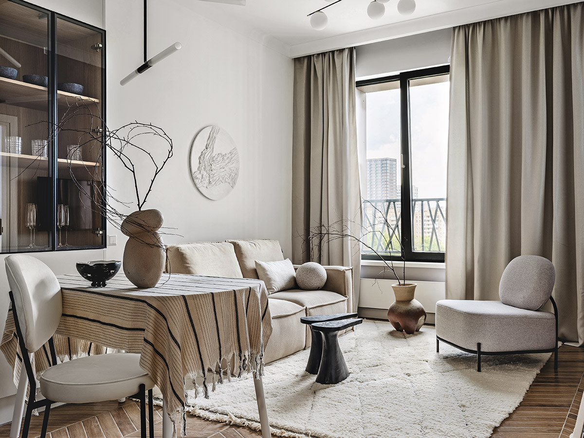 Элементы и философия популярного стиля джапанди, к которым добавлена пара акцентов из аскетичного лофта, помогли превратить обычную квартиру в лаконичное, но комфортное место отдыха от шума большого города и бешеного ритма жизни
