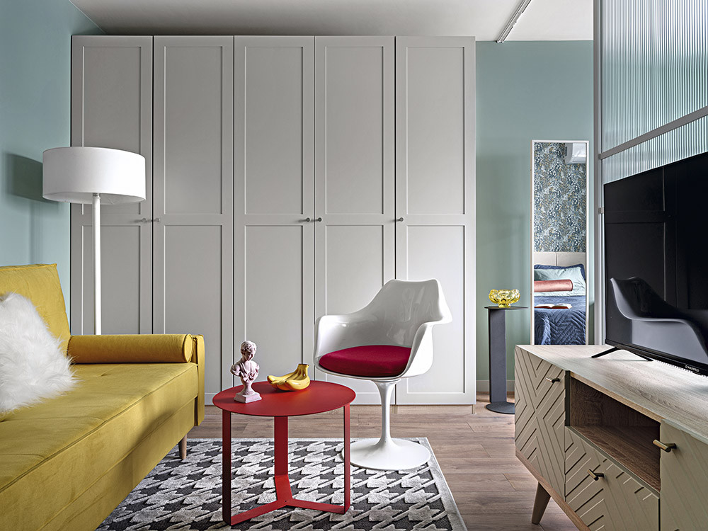 Эта квартира предназначена для долгосрочной аренды. В результате переделки появился современный эклектичный интерьер с нотками авангарда. Они проявляются в ярких, контрастных сочетаниях отделки, мебели и аксессуаров. Такой яркий, жизнерадостный стиль прекрасно подошёл квартире и сделал её конкурентной на рынке аренды. В перспективе она станет домом для взрослого сына хозяйки. Через пару лет «базу», заложенную дизайнером, достаточно будет лишь немного освежить под нового хозяина.