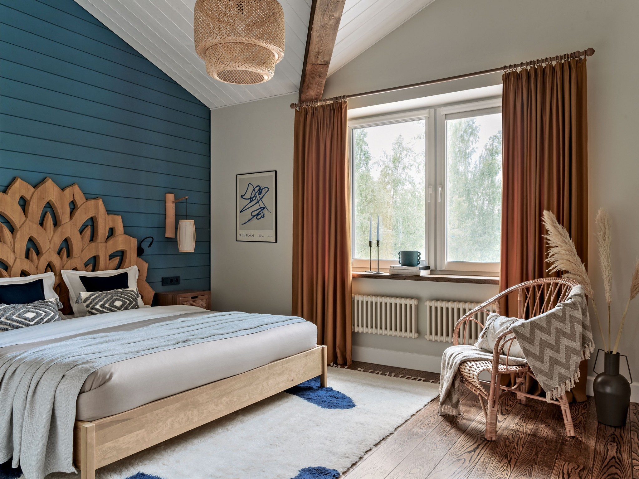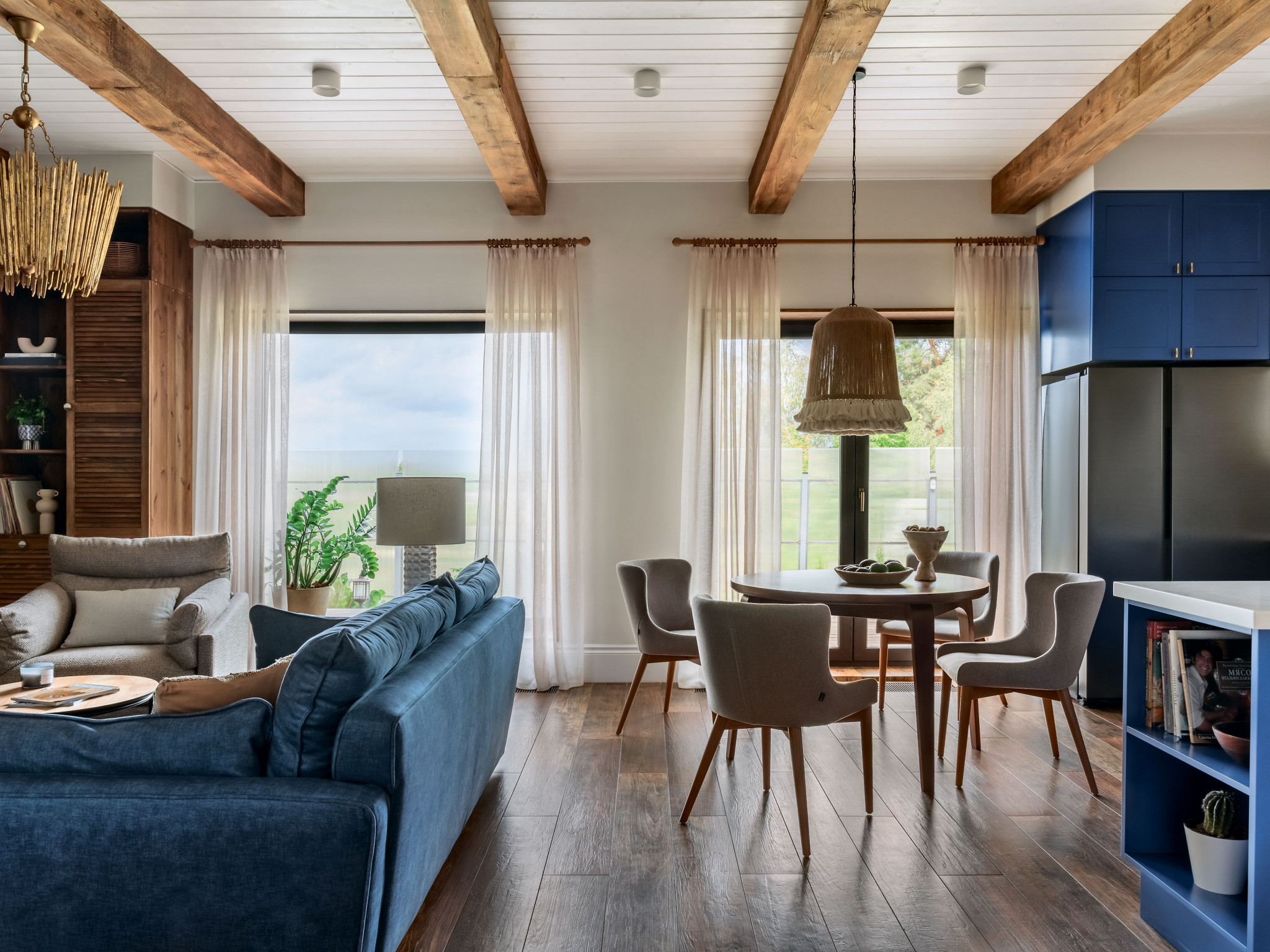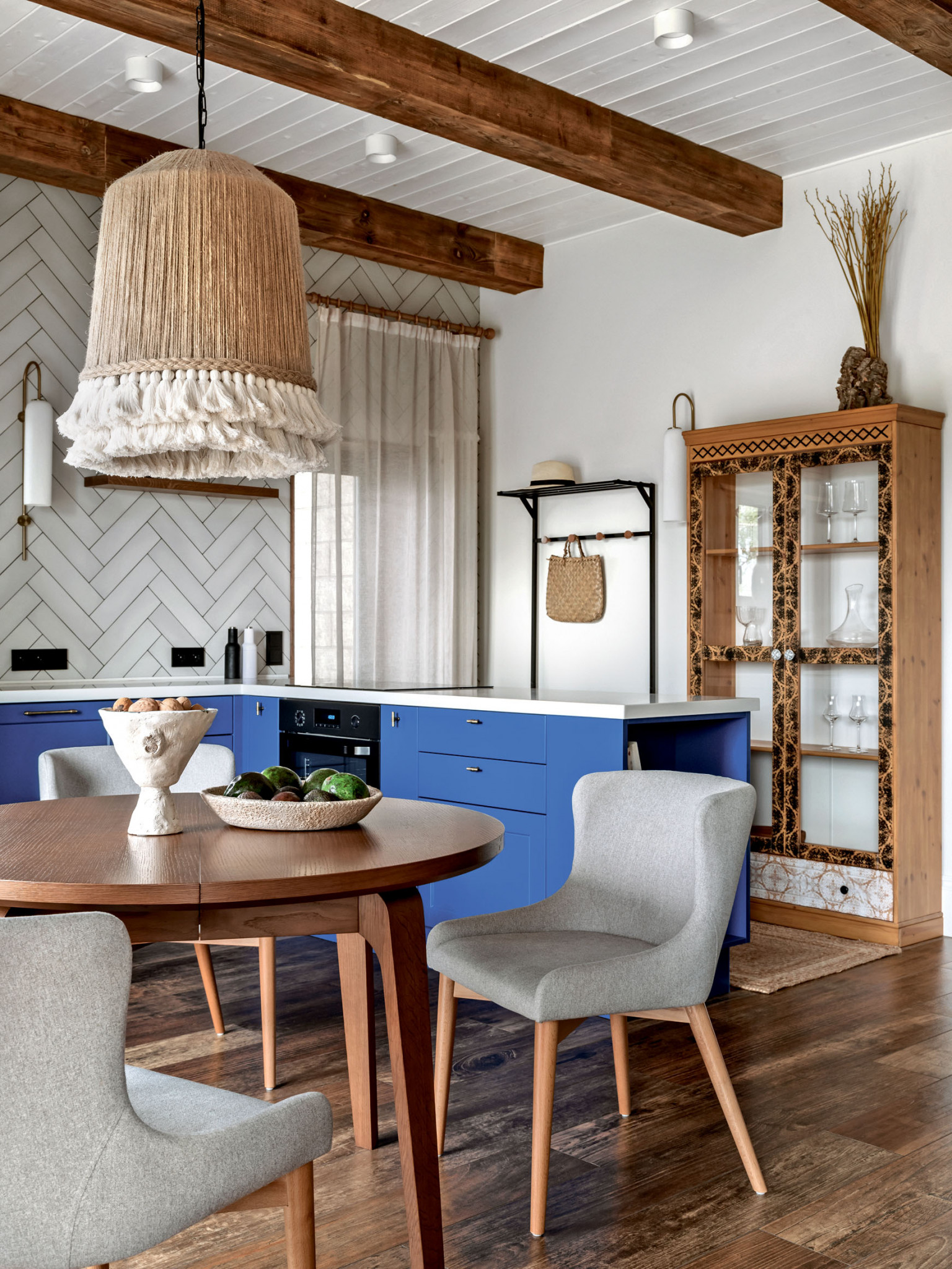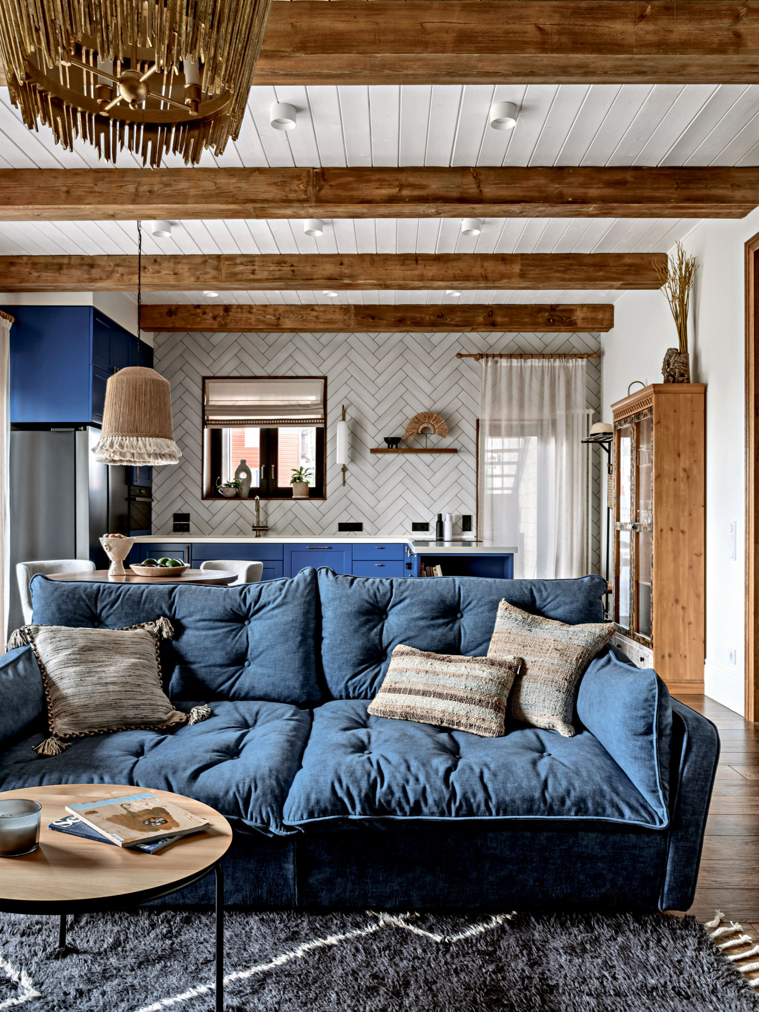 Дерево, керамика, ротанг, джут, бамбук, хлопок и лён. Натуральные материалы поддерживают тему природы в интерьере, одновременно участвуют в формировании атмосферы дома и отвечают за единство стилистики. Она складывается из нескольких составляющих: что-то здесь есть от стиля кантри, что-то от альпийского шале и бохо. Тут есть и элементы сканди, но состаренного, «потёртого», и приметы уютного mid-century. Живые растения усиливают эффект деревенского дома. Заказчица относится к домашним растениям трепетно, и для каждого с большой любовью подобрала кашпо.