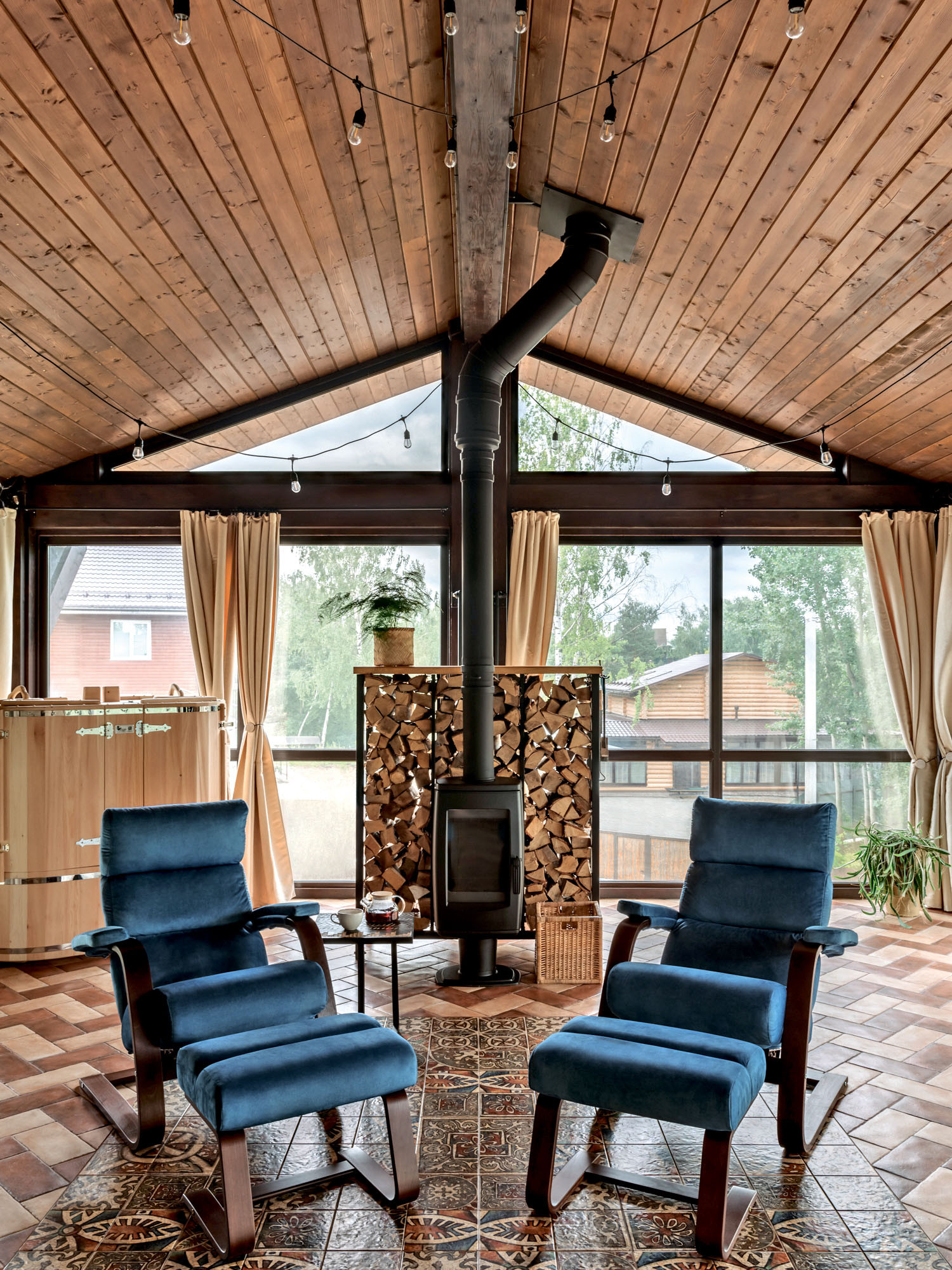 Архитектор создала уютное пространство для отдыха в любое время года, обеспечив хозяевам и их друзьям комфорт современного отеля и душевное тепло деревенского дома в горах. Предметом вдохновения стали путешествия заказчиков, их любовь к горам, домашнему виноделию, живым цветам