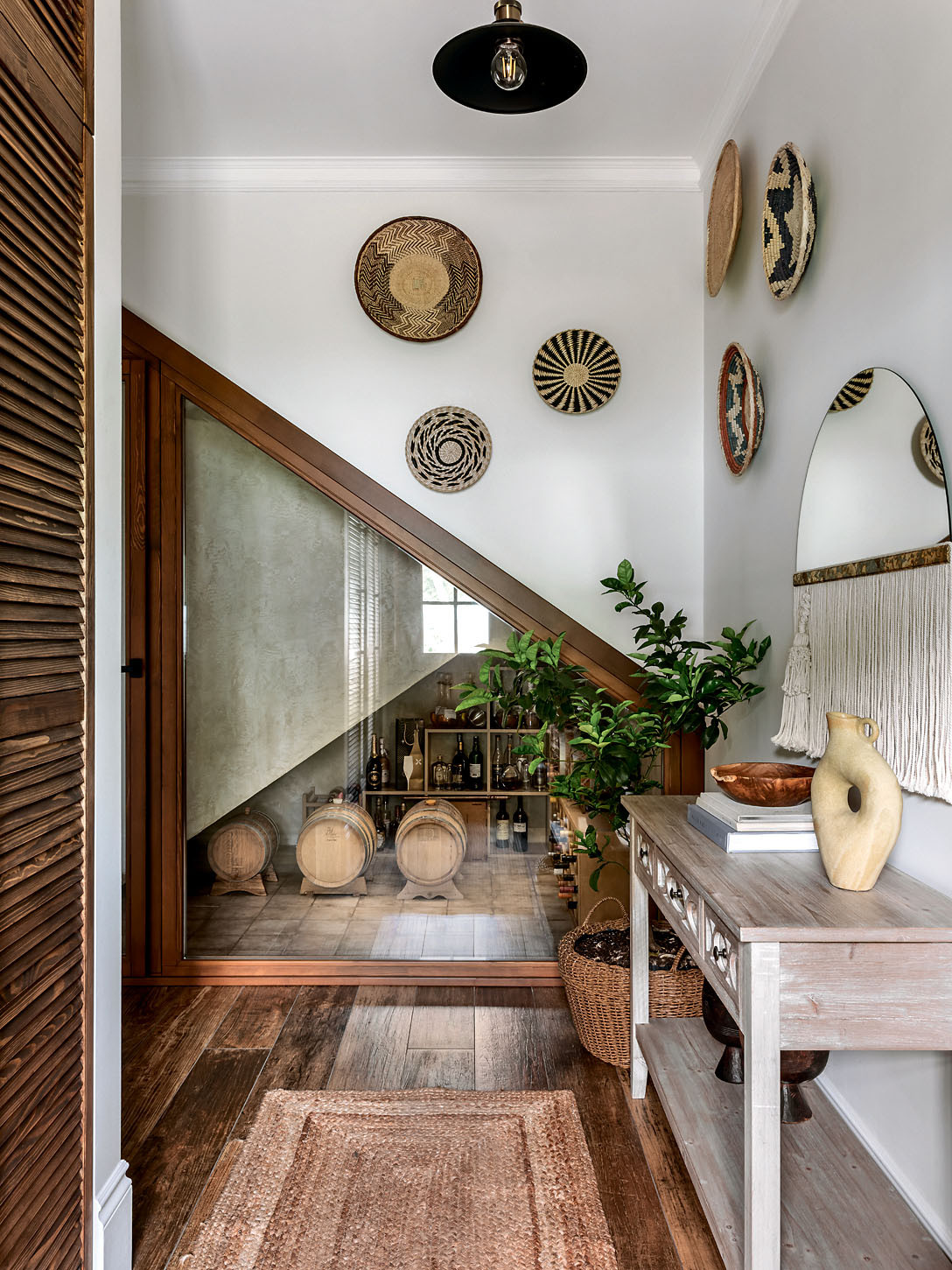 Заказчики — супружеская пара, люди активные, увлекающиеся спортом, а с некоторых пор ещё и виноделием. Устав от жизни в столице, они решили перебраться за город и обустроить всё для комфортной жизни рядом с природой. У обоих ответственная работа, поэтому им хотелось получить пространство, которое будет настраивать на безмятежный отдых, напоминать о путешествиях и станет отличным местом для встреч с друзьями. Была у заказчиков и особенная просьба: сделать винную комнату — специальное помещение, где будет храниться авторское домашнее вино, будут стоять бочки и бутылки. Место для неё нашлось под лестницей, ведущей на второй этаж, причём это помещение решили сделать акцентным: теперь прямо от входа открывается вид на окно в стене, за которым видны все эти очень атмосферные вещи. И они идеально вписались в стилистику интерьера.